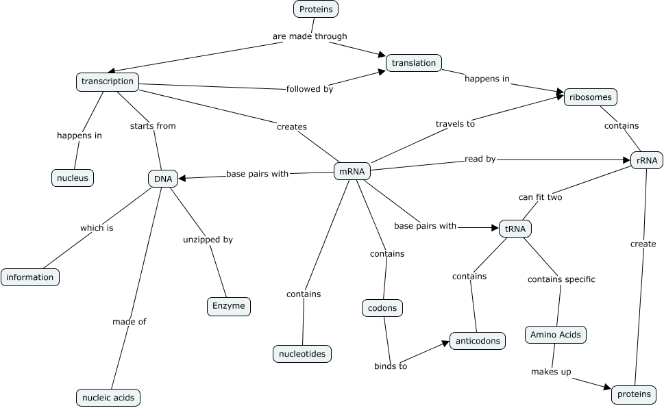 This Concept Map, created with IHMC CmapTools, has information related to: Protein Synthesis, Proteins are made through transcription, translation happens in ribosomes, rRNA create proteins, tRNA contains anticodons, codons binds to anticodons, DNA which is information, DNA made of nucleic acids, Amino Acids makes up proteins, ribosomes contains rRNA, transcription starts from DNA, mRNA read by rRNA, transcription followed by translation, transcription happens in nucleus, tRNA contains specific Amino Acids, mRNA base pairs with DNA, mRNA contains codons, rRNA can fit two tRNA, transcription creates mRNA, mRNA contains nucleotides, mRNA travels to ribosomes