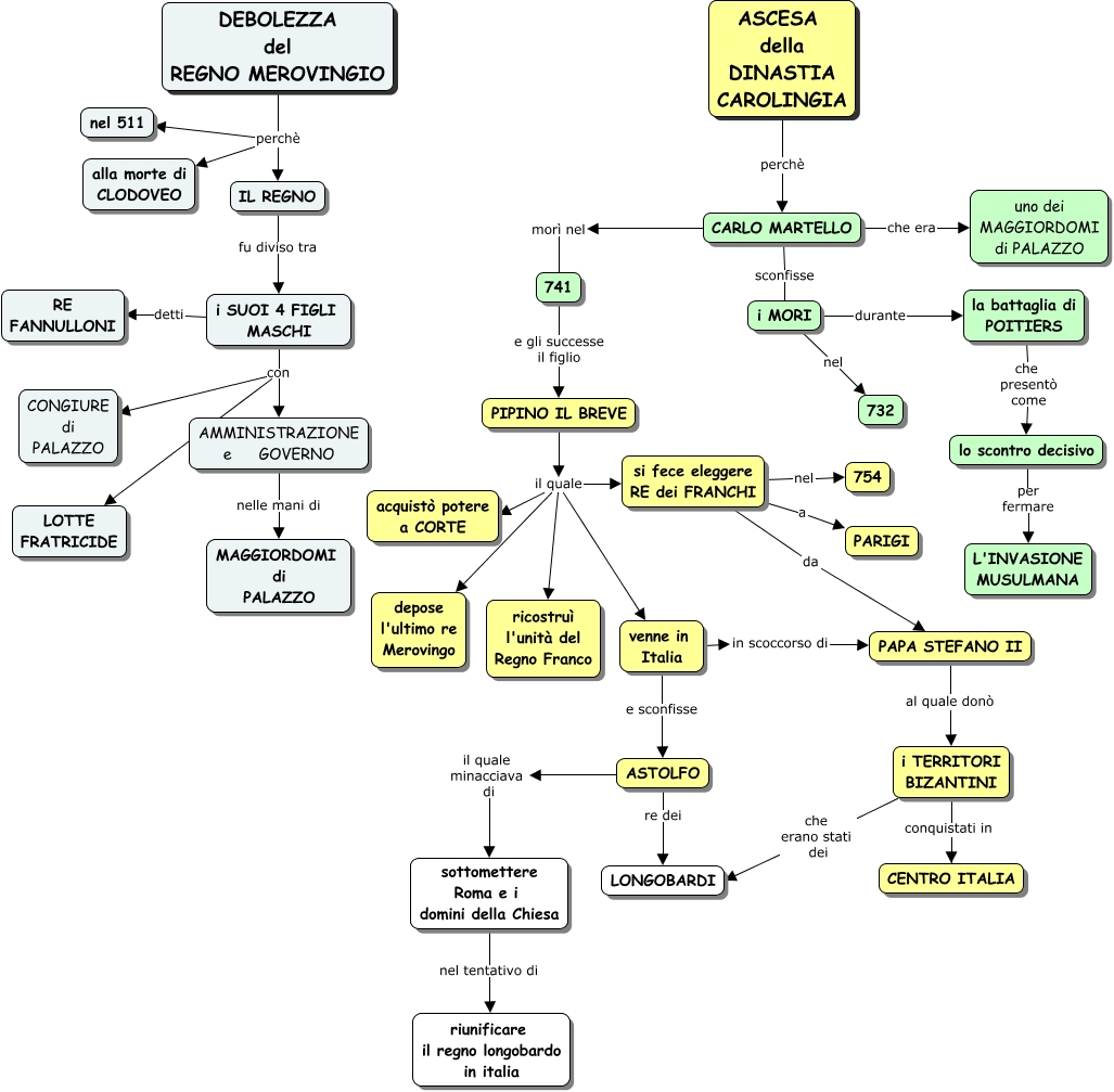 Questa Cmap, creata con IHMC CmapTools, contiene informazioni relative a: DINASTIA MEROVINGIA E CAROLINGIA, PIPINO IL BREVE il quale acquistò potere a CORTE, i SUOI 4 FIGLI MASCHI con CONGIURE di PALAZZO, i SUOI 4 FIGLI MASCHI detti RE FANNULLONI, i MORI durante la battaglia di POITIERS, PIPINO IL BREVE il quale venne in Italia, AMMINISTRAZIONE e GOVERNO nelle mani di MAGGIORDOMI di PALAZZO, si fece eleggere RE dei FRANCHI da PAPA STEFANO II, sottomettere Roma e i domini della Chiesa nel tentativo di riunificare il regno longobardo in italia, i SUOI 4 FIGLI MASCHI con LOTTE FRATRICIDE, PAPA STEFANO II al quale donò i TERRITORI BIZANTINI, IL REGNO fu diviso tra i SUOI 4 FIGLI MASCHI, i SUOI 4 FIGLI MASCHI con AMMINISTRAZIONE e GOVERNO, DEBOLEZZA del REGNO MEROVINGIO perchè IL REGNO, venne in Italia e sconfisse ASTOLFO, DEBOLEZZA del REGNO MEROVINGIO perchè nel 511, CARLO MARTELLO che era uno dei MAGGIORDOMI di PALAZZO, i TERRITORI BIZANTINI conquistati in CENTRO ITALIA, venne in Italia in scoccorso di PAPA STEFANO II, 741 e gli successe il figlio PIPINO IL BREVE, PIPINO IL BREVE il quale si fece eleggere RE dei FRANCHI