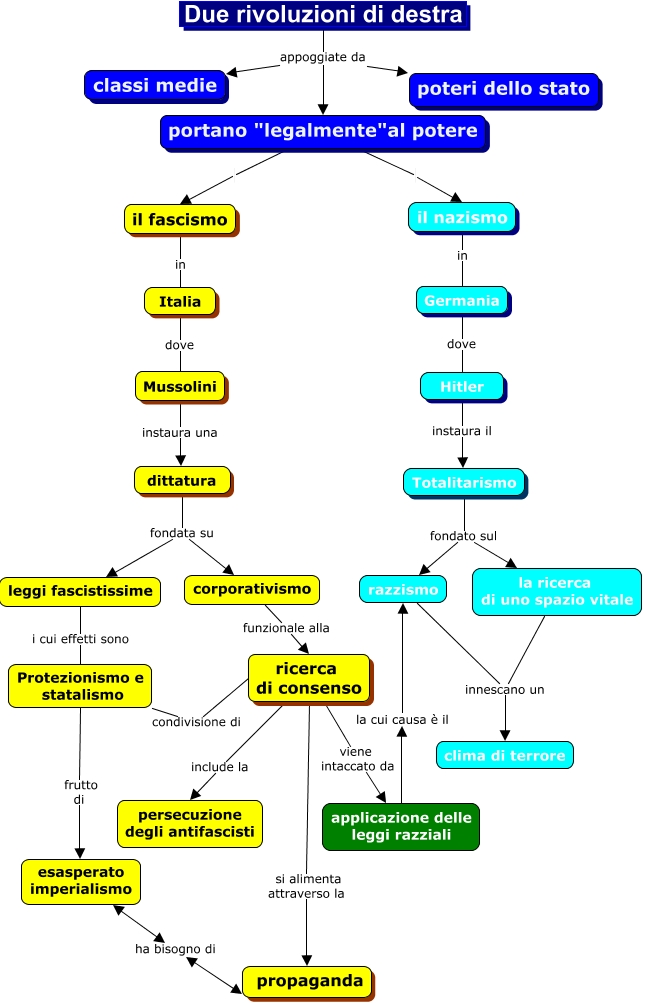 Questa Cmap, creata con IHMC CmapTools, contiene informazioni relative a: mappa del fascismo e del nazismo, Totalitarismo fondato sul razzismo, il nazismo in Germania, Hitler instaura il Totalitarismo, esasperato imperialismo ha bisogno di propaganda, Due rivoluzioni di destra appoggiate da portano "legalmente"al potere, Due rivoluzioni di destra appoggiate da classi medie, ricerca di consenso viene intaccato da applicazione delle leggi razziali, ricerca di consenso si alimenta attraverso la propaganda, Due rivoluzioni di destra appoggiate da poteri dello stato, Germania dove Hitler, dittatura fondata su leggi fascistissime, razzismo innescano un clima di terrore, Protezionismo e statalismo condivisione di ricerca di consenso, Protezionismo e statalismo frutto di esasperato imperialismo, portano "legalmente"al potere il nazismo, il fascismo in Italia, applicazione delle leggi razziali la cui causa è il razzismo, ricerca di consenso include la persecuzione degli antifascisti, dittatura fondata su corporativismo, Mussolini instaura una dittatura