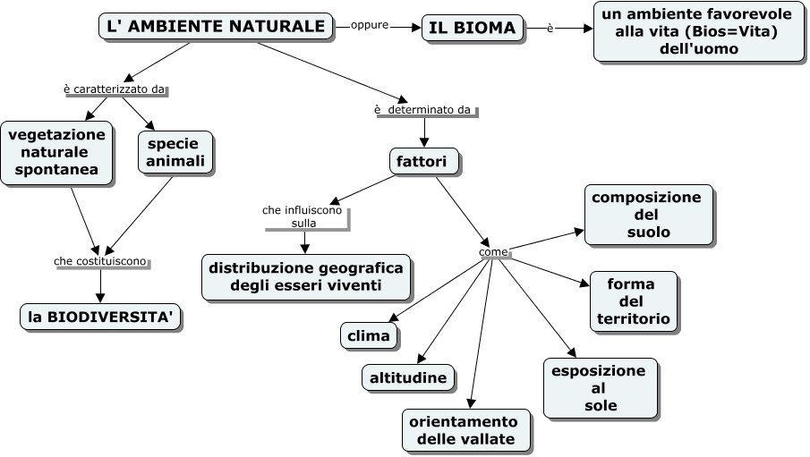 Questa Cmap, creata con IHMC CmapTools, contiene informazioni relative a: BIOMA, L' AMBIENTE NATURALE è determinato da fattori, fattori come altitudine, vegetazione naturale spontanea che costituiscono la BIODIVERSITA', fattori come orientamento delle vallate, L' AMBIENTE NATURALE è caratterizzato da specie animali, specie animali che costituiscono la BIODIVERSITA', L' AMBIENTE NATURALE oppure IL BIOMA, IL BIOMA è un ambiente favorevole alla vita (Bios=Vita) dell'uomo, fattori come esposizione al sole, L' AMBIENTE NATURALE è caratterizzato da vegetazione naturale spontanea, fattori come composizione del suolo, fattori come clima, fattori che influiscono sulla distribuzione geografica degli esseri viventi, fattori come forma del territorio