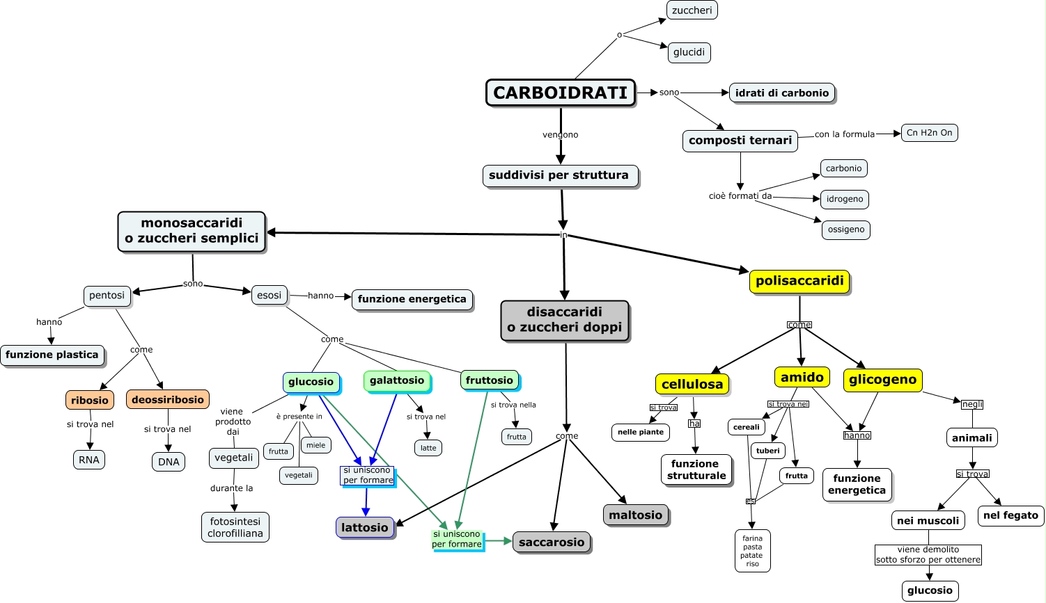 Questa Cmap, creata con IHMC CmapTools, contiene informazioni relative a: CARBOIDRATI, composti ternari cioè formati da carbonio, glucosio si uniscono per formare lattosio, suddivisi per struttura in monosaccaridi o zuccheri semplici, animali si trova nei muscoli, cellulosa ha funzione strutturale, glucosio è presente in frutta, pentosi come deossiribosio, deossiribosio si trova nel DNA, amido si trova nei tuberi, tuberi es farina pasta patate riso, glicogeno hanno funzione energetica, frutta es farina pasta patate riso, polisaccaridi come amido, pentosi hanno funzione plastica, monosaccaridi o zuccheri semplici sono pentosi, amido si trova nei frutta, polisaccaridi come cellulosa, esosi hanno funzione energetica, composti ternari con la formula Cn H2n On, fruttosio si trova nella frutta