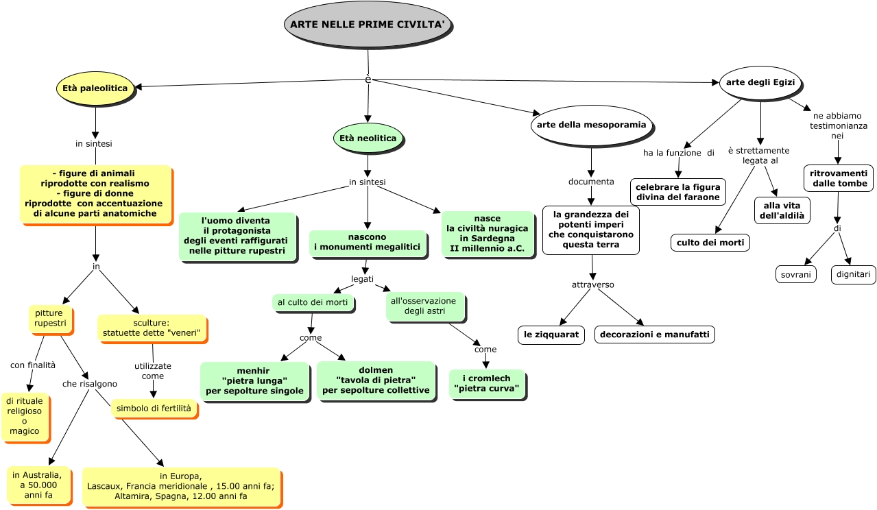 Questa Cmap, creata con IHMC CmapTools, contiene informazioni relative a: Arte delle prime civiltà, all'osservazione degli astri come i cromlech "pietra curva", - figure di animali riprodotte con realismo - figure di donne riprodotte con accentuazione di alcune parti anatomiche in pitture rupestri, pitture rupestri con finalità di rituale religioso o magico, Età neolitica in sintesi nasce la civiltà nuragica in Sardegna II millennio a.C., la grandezza dei potenti imperi che conquistarono questa terra attraverso le ziqquarat, ARTE NELLE PRIME CIVILTA' è Età neolitica, arte degli Egizi ha la funzione di celebrare la figura divina del faraone, al culto dei morti come dolmen "tavola di pietra" per sepolture collettive, ARTE NELLE PRIME CIVILTA' è arte degli Egizi, ARTE NELLE PRIME CIVILTA' è arte della mesoporamia, Età neolitica in sintesi nascono i monumenti megalitici, arte degli Egizi è strettamente legata al alla vita dell'aldilà, ritrovamenti dalle tombe di dignitari, Età paleolitica in sintesi - figure di animali riprodotte con realismo - figure di donne riprodotte con accentuazione di alcune parti anatomiche, arte degli Egizi ne abbiamo testimonianza nei ritrovamenti dalle tombe, nascono i monumenti megalitici legati al culto dei morti, Età neolitica in sintesi l'uomo diventa il protagonista degli eventi raffigurati nelle pitture rupestri, la grandezza dei potenti imperi che conquistarono questa terra attraverso decorazioni e manufatti, sculture: statuette dette "veneri" utilizzate come simbolo di fertilità, - figure di animali riprodotte con realismo - figure di donne riprodotte con accentuazione di alcune parti anatomiche in sculture: statuette dette "veneri"