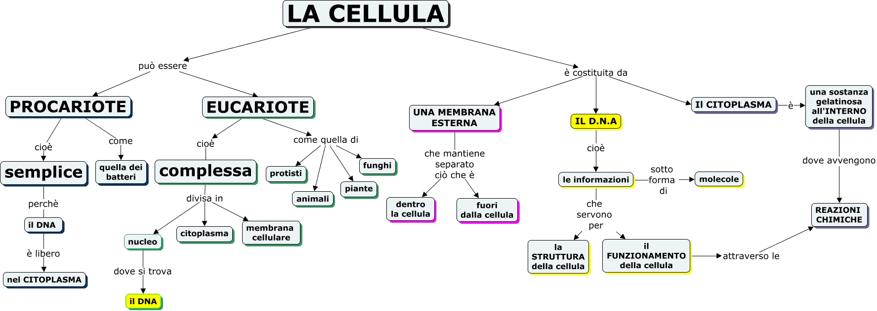 Questa Cmap, creata con IHMC CmapTools, contiene informazioni relative a: LA CELLULA, le informazioni che servono per la STRUTTURA della cellula, nucleo dove si trova il DNA, EUCARIOTE come quella di protisti, EUCARIOTE cioè complessa, EUCARIOTE come quella di piante, il DNA è libero nel CITOPLASMA, le informazioni che servono per il FUNZIONAMENTO della cellula, il FUNZIONAMENTO della cellula attraverso le REAZIONI CHIMICHE, complessa divisa in citoplasma, UNA MEMBRANA ESTERNA che mantiene separato ciò che è fuori dalla cellula, complessa divisa in membrana cellulare, LA CELLULA è costituita da Il CITOPLASMA, PROCARIOTE come quella dei batteri, LA CELLULA può essere PROCARIOTE, EUCARIOTE come quella di animali, PROCARIOTE cioè semplice, una sostanza gelatinosa all'INTERNO della cellula dove avvengono REAZIONI CHIMICHE, EUCARIOTE come quella di funghi, semplice perchè il DNA, le informazioni sotto forma di molecole