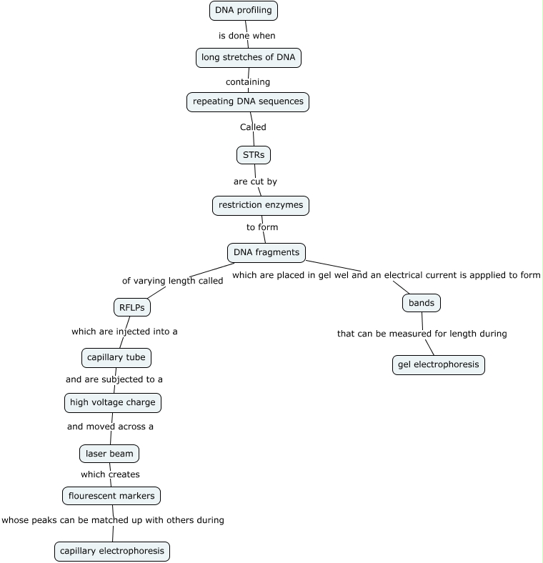 This Concept Map, created with IHMC CmapTools, has information related to: DNA Profiling, capillary tube and are subjected to a high voltage charge, DNA fragments which are placed in gel wel and an electrical current is appplied to form bands, flourescent markers whose peaks can be matched up with others during capillary electrophoresis, long stretches of DNA containing repeating DNA sequences, STRs are cut by restriction enzymes, high voltage charge and moved across a laser beam, repeating DNA sequences Called STRs, DNA fragments of varying length called RFLPs, laser beam which creates flourescent markers, bands that can be measured for length during gel electrophoresis, RFLPs which are injected into a capillary tube, restriction enzymes to form DNA fragments, DNA profiling is done when long stretches of DNA