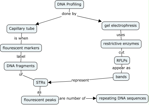 This Concept Map, created with IHMC CmapTools, has information related to: DNA Profiling, DNA Profiling done by gel electrophresis, DNA fragments of STRs, gel electrophresis uses restrictive enzymes, restrictive enzymes cut RFLPs, bands represent STRs, DNA Profiling done by Capillary tube, Capillary tube is when flourescent markers, RFLPs appear as bands, flourescent peaks are number of repeating DNA sequences, STRs as flourescent peaks, flourescent markers label DNA fragments
