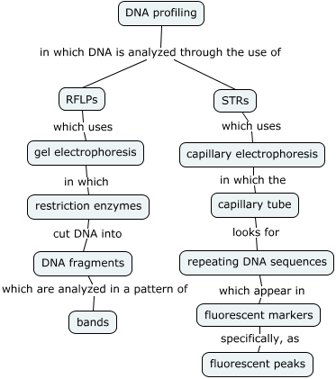 This Concept Map, created with IHMC CmapTools, has information related to: DNA Profiling, DNA profiling in which DNA is analyzed through the use of STRs, DNA profiling in which DNA is analyzed through the use of RFLPs, restriction enzymes cut DNA into DNA fragments, capillary tube looks for repeating DNA sequences, STRs which uses capillary electrophoresis, repeating DNA sequences which appear in fluorescent markers, fluorescent markers specifically, as fluorescent peaks, capillary electrophoresis in which the capillary tube, RFLPs which uses gel electrophoresis, gel electrophoresis in which restriction enzymes, DNA fragments which are analyzed in a pattern of bands