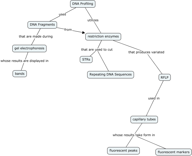 This Concept Map, created with IHMC CmapTools, has information related to: DNA Profiling, restriction enzymes that are used to cut STRs, DNA Profiling utilizes restriction enzymes, DNA Fragments from restriction enzymes, gel electrophoresis whose results are displayed in bands, DNA Profiling uses DNA Fragments, capillary tubes whose results take form in fluorescent peaks, RFLP used in capillary tubes, restriction enzymes that are used to cut Repeating DNA Sequences, restriction enzymes that produces variated RFLP, DNA Fragments that are made during gel electrophoresis, capillary tubes whose results take form in fluorescent markers