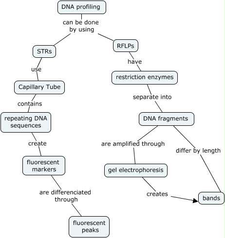 This Concept Map, created with IHMC CmapTools, has information related to: DNA Profiling, DNA profiling can be done by using STRs, gel electrophoresis creates bands, DNA profiling can be done by using RFLPs, STRs use Capillary Tube, DNA fragments are amplified through gel electrophoresis, fluorescent markers are differenciated through fluorescent peaks, DNA fragments differ by length bands, Capillary Tube contains repeating DNA sequences, RFLPs have restriction enzymes, restriction enzymes separate into DNA fragments, repeating DNA sequences create fluorescent markers