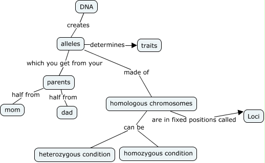 This Concept Map, created with IHMC CmapTools, has information related to: Inheritance, alleles which you get from your parents, homologous chromosomes can be homozygous condition, homologous chromosomes can be heterozygous condition, parents half from mom, DNA creates alleles, alleles made of homologous chromosomes, parents half from dad, alleles determines traits, homologous chromosomes are in fixed positions called Loci