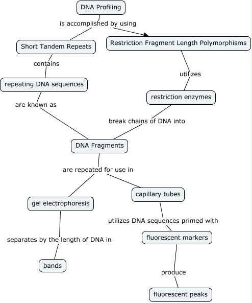 This Concept Map, created with IHMC CmapTools, has information related to: DNA Profiling, DNA Profiling is accomplished by using Restriction Fragment Length Polymorphisms, DNA Fragments are repeated for use in gel electrophoresis, fluorescent markers produce fluorescent peaks, gel electrophoresis separates by the length of DNA in bands, restriction enzymes break chains of DNA into DNA Fragments, DNA Fragments are repeated for use in capillary tubes, Short Tandem Repeats contains repeating DNA sequences, DNA Profiling is accomplished by using Short Tandem Repeats, repeating DNA sequences are known as DNA Fragments, Restriction Fragment Length Polymorphisms utilizes restriction enzymes, capillary tubes utilizes DNA sequences primed with fluorescent markers