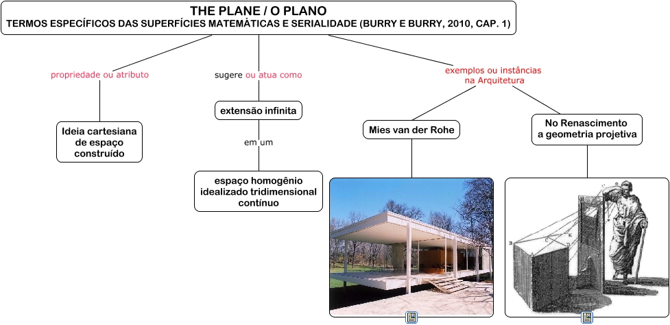 Esse mapa conceitual, produzido no IHMC CmapTools, tem a informação relacionada a: theplane_cap1, THE PLANE / O PLANO TERMOS ESPECÍFICOS DAS SUPERFÍCIES MATEMÁTICAS E SERIALIDADE (BURRY E BURRY, 2010, CAP. 1) sugere ou atua como extensão infinita, THE PLANE / O PLANO TERMOS ESPECÍFICOS DAS SUPERFÍCIES MATEMÁTICAS E SERIALIDADE (BURRY E BURRY, 2010, CAP. 1) propriedade ou atributo Ideia cartesiana de espaço construído, THE PLANE / O PLANO TERMOS ESPECÍFICOS DAS SUPERFÍCIES MATEMÁTICAS E SERIALIDADE (BURRY E BURRY, 2010, CAP. 1) exemplos ou instâncias na Arquitetura Mies van der Rohe, THE PLANE / O PLANO TERMOS ESPECÍFICOS DAS SUPERFÍCIES MATEMÁTICAS E SERIALIDADE (BURRY E BURRY, 2010, CAP. 1) exemplos ou instâncias na Arquitetura No Renascimento a geometria projetiva, No Renascimento a geometria projetiva, extensão infinita em um espaço homogênio idealizado tridimensional contínuo, Mies van der Rohe