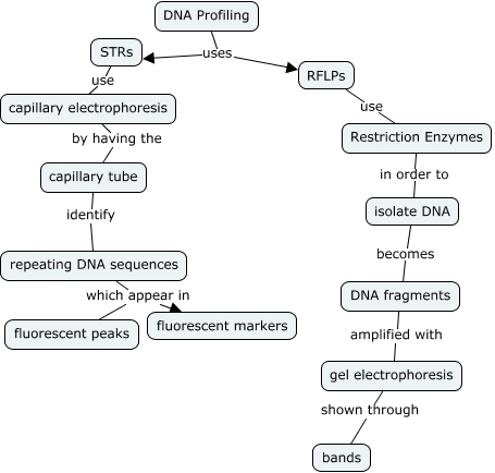 This Concept Map, created with IHMC CmapTools, has information related to: DNA Profiling, DNA fragments amplified with gel electrophoresis, RFLPs use Restriction Enzymes, STRs use capillary electrophoresis, DNA Profiling uses STRs, repeating DNA sequences which appear in fluorescent peaks, isolate DNA becomes DNA fragments, DNA Profiling uses RFLPs, repeating DNA sequences which appear in fluorescent markers, capillary tube identify repeating DNA sequences, capillary electrophoresis by having the capillary tube, gel electrophoresis shown through bands, Restriction Enzymes in order to isolate DNA