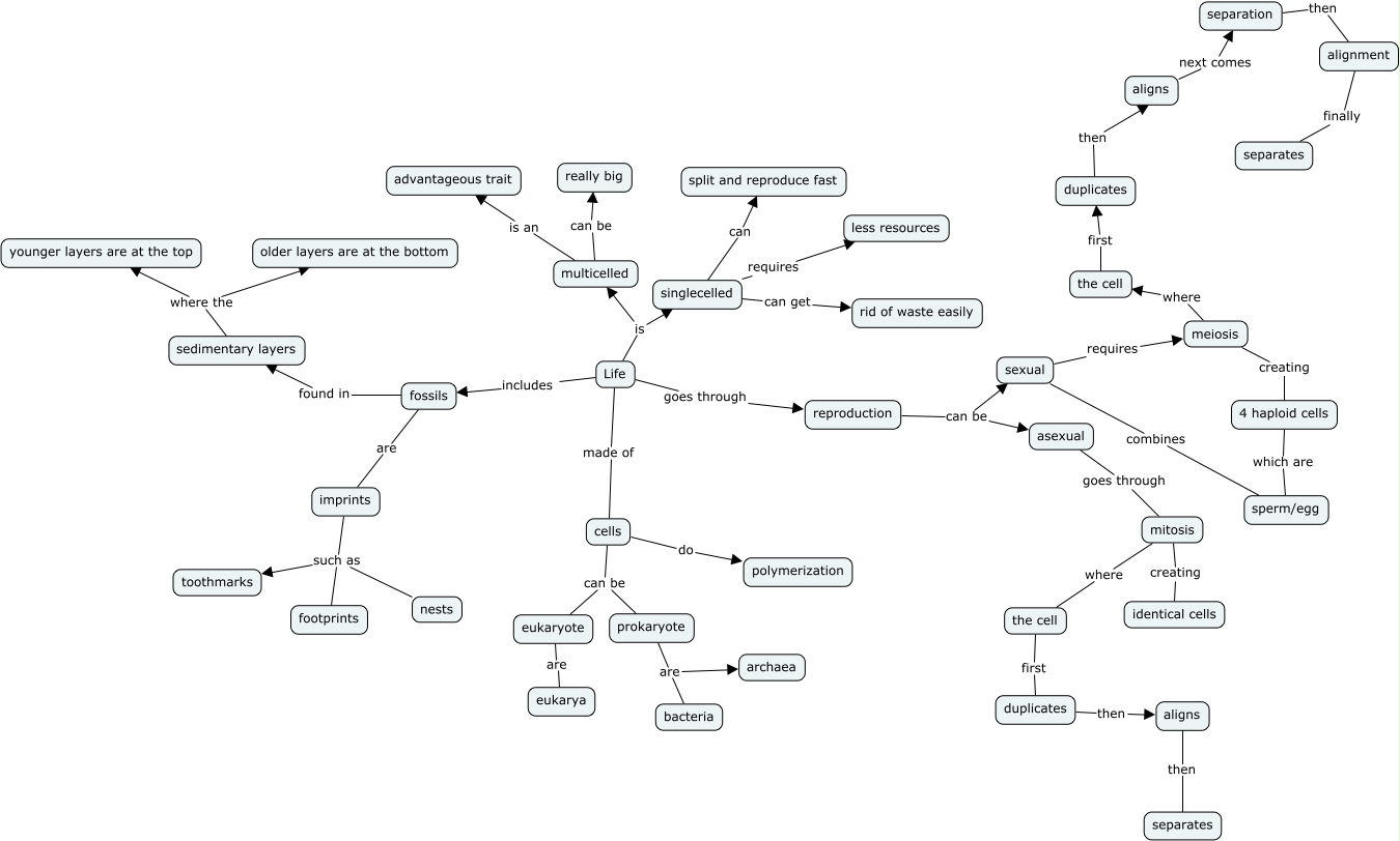 This Concept Map, created with IHMC CmapTools, has information related to: Spring Extra Credit, the cell first duplicates, singlecelled can get rid of waste easily, reproduction can be asexual, imprints such as toothmarks, imprints such as nests, alignment finally separates, meiosis creating 4 haploid cells, Life is multicelled, sedimentary layers where the younger layers are at the top, imprints such as footprints, singlecelled requires less resources, prokaryote are bacteria, cells can be eukaryote, mitosis creating identical cells, asexual goes through mitosis, separation then alignment, cells do polymerization, singlecelled can split and reproduce fast, aligns next comes separation, Life goes through reproduction