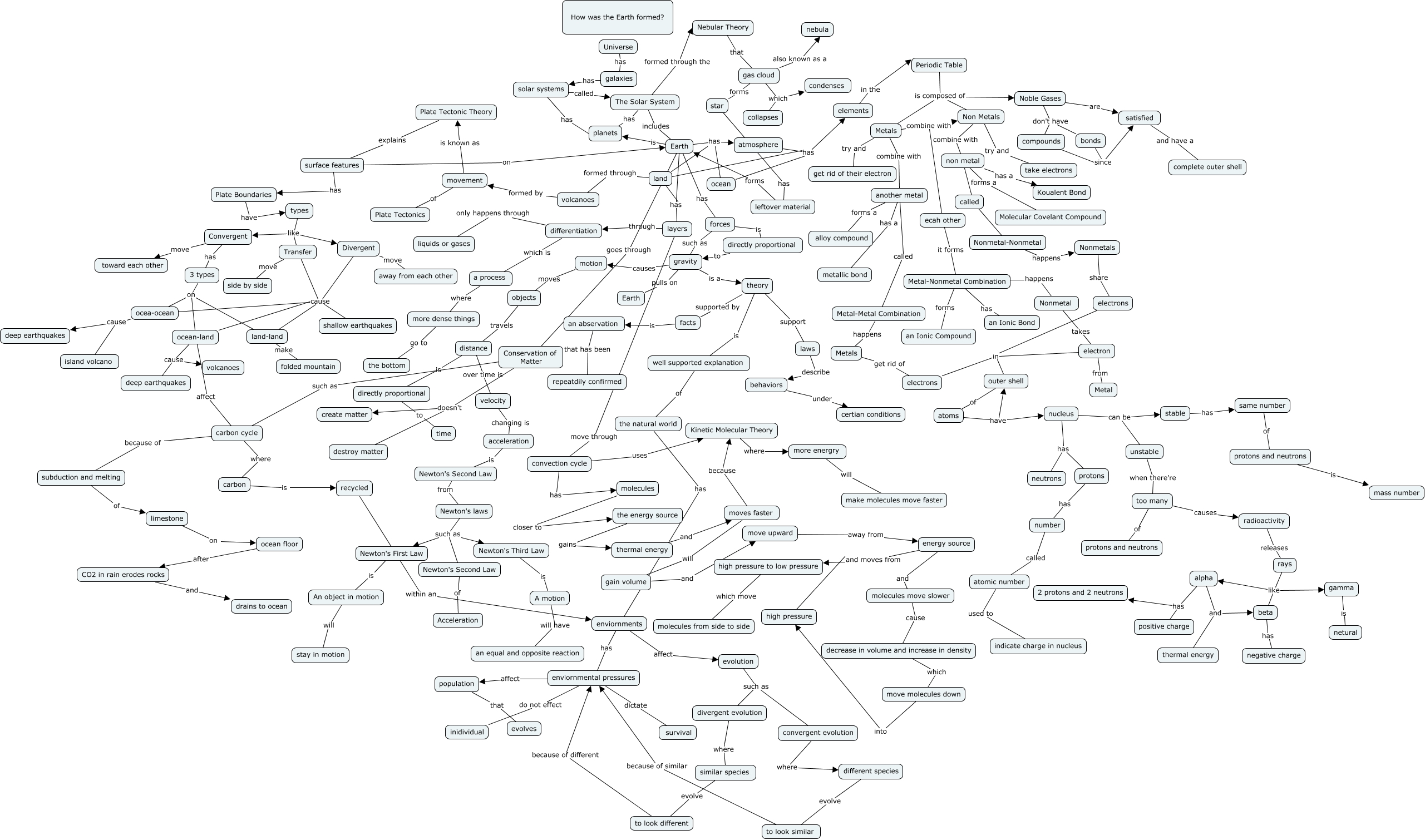 This Concept Map, created with IHMC CmapTools, has information related to: Extra Credit Spring How was the Earth formed, types like Transfer, non metal has a Koualent Bond, volcanoes formed by movement, more dense things go to the bottom, divergent evolution where similar species, nucleus has neutrons, behaviors under certian conditions, different species evolve to look similar, atoms have outer shell, Plate Tectonic Theory explains surface features, differentiation which is a process, A motion will have an equal and opposite reaction, atomic number used to indicate charge in nucleus, acceleration is Newton's Second Law, rays like alpha, too many of protons and neutrons, Metals combine with ecah other, Convergent move toward each other, Noble Gases don't have bonds, move molecules down into high pressure