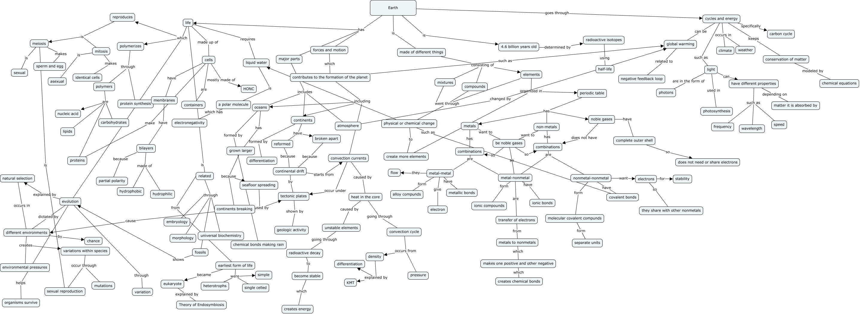 This Concept Map, created with IHMC CmapTools, has information related to: Extra Credit CMAP Spring Semester, natural selection occurs in different environments, combinations are metal-metal, combinations are nonmetal-nonmetal, related through universal biochemistry, bilayers because partial polarity, membranes have bilayers, different environments creates environmental pressures, cycles and energy keeps conservation of matter, mixtures went through physical or chemical change, continents have broken apart, non-metals has combinations, non-metals want to be noble gases, physical or chemical change to create more elements, made of different things consisting of elements, related through embryology, elements organized in periodic table, unstable elements going through radioactive decay, global warming related to negative feedback loop, metals want to be noble gases, be noble gases so combinations
