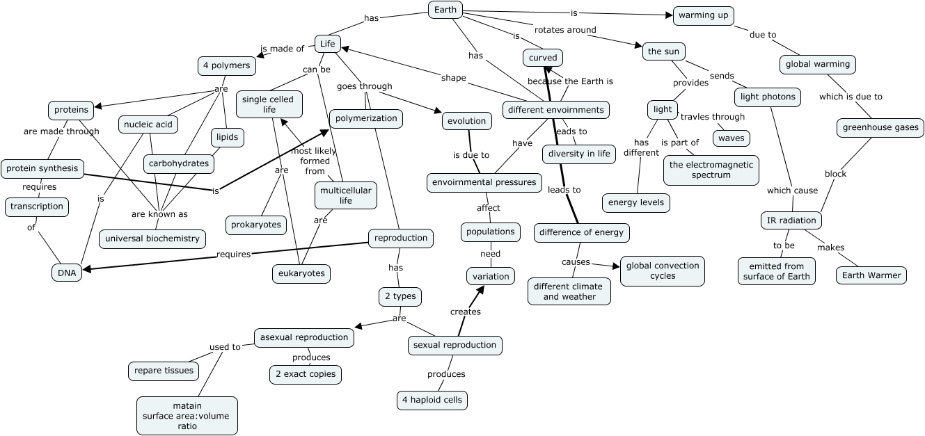 This Concept Map, created with IHMC CmapTools, has information related to: Extra Credit Semester 2, nucleic acid is DNA, Life can be multicellular life, Earth has different envoirnments, Earth is warming up, difference of energy causes different climate and weather, 2 types are asexual reproduction, light photons which cause IR radiation, different envoirnments leads to diversity in life, Life goes through evolution, sexual reproduction produces 4 haploid cells, asexual reproduction produces 2 exact copies, Life is made of 4 polymers, reproduction requires DNA, Earth is curved, asexual reproduction used to repare tissues, 4 polymers are proteins, lipids are known as universal biochemistry, 4 polymers are carbohydrates, warming up due to global warming, protein synthesis requires transcription