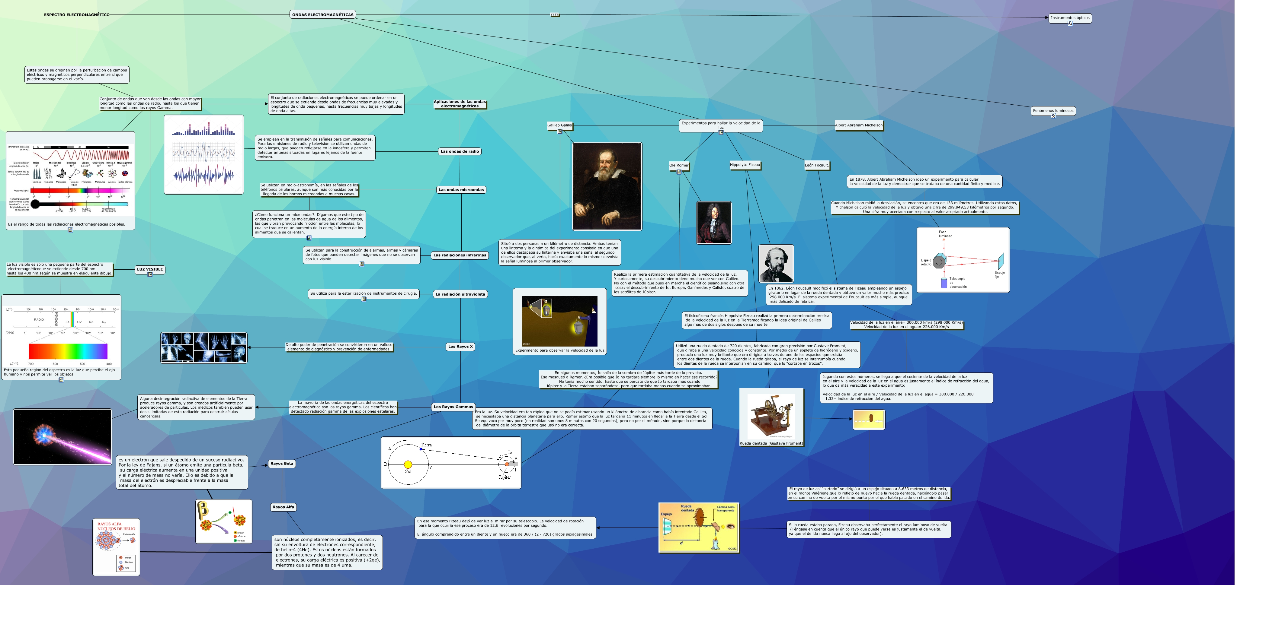 Este Cmap, tiene información relacionada con: MAPA CONCEPTUAL-ONDAS ELECTROMAGNETICAS, Utilizó una rueda dentada de 720 dientes, fabricada con gran precisión por Gustave Froment, que giraba a una velocidad conocida y constante. Por medio de un soplete de hidrógeno y oxígeno, producía una luz muy brillante que era dirigida a través de uno de los espacios que existía entre dos dientes de la rueda. Cuando la rueda giraba, el rayo de luz se interrumpía cuando los dientes de la rueda se interponían en su camino, que lo “cortaba en trozos”. Rueda dentada (Gustave Froment), Experimentos para hallar la velocidad de la luz Galileo Galilei, Los Rayos Gammas La mayoría de las ondas energéticas del espectro electromagnético son los rayos gamma. Los científicos han detectado radiación gamma de las explosiones estelares. Alguna desintegración radiactiva de elementos de la Tierra produce rayos gamma, y son creados artificialmente por aceleradores de partículas. Los médicos también pueden usar dosis limitadas de esta radiación para destruir células cancerosas., Estas ondas se originan por la perturbación de campos eléctricos y magnéticos perpendiculares entre sí que pueden propagarse en el vacío. Conjunto de ondas que van desde las ondas con mayor longitud como las ondas de radio, hasta los que tienen menor longitud como los rayos Gamma. Es el rango de todas las radiaciones electromagnéticas posibles., Experimentos para hallar la velocidad de la luz Hippolyte Fizeau El físicofizeau francés Hippolyte Fizeau realizó la primera determinación precisa de la velocidad de la luz en la Tierramodificando la idea original de Galileo algo más de dos siglos después de su muerte, Experimentos para hallar la velocidad de la luz Ole Romer, La radiación ultravioleta Los Rayos X, ONDAS ELECTROMAGNÉTICAS ESPECTRO ELECTROMAGNÉTICO Estas ondas se originan por la perturbación de campos eléctricos y magnéticos perpendiculares entre sí que pueden propagarse en el vacío., En 1878, Albert Abraham Michelson ideó un experimento para calcular la velocidad de la luz y demostrar que se trataba de una cantidad finita y medible. Cuando Michelson midió la desviación, se encontró que era de 133 milímetros. Utilizando estos datos, Michelson calculó la velocidad de la luz y obtuvo una cifra de 299.949,53 kilómetros por segundo. Una cifra muy acertada con respecto al valor aceptado actualmente., son núcleos completamente ionizados, es decir, sin su envoltura de electrones correspondiente, de helio-4 (4He). Estos núcleos están formados por dos protones y dos neutrones. Al carecer de electrones, su carga eléctrica es positiva (+2qe), mientras que su masa es de 4 uma., Alguna desintegración radiactiva de elementos de la Tierra produce rayos gamma, y son creados artificialmente por aceleradores de partículas. Los médicos también pueden usar dosis limitadas de esta radiación para destruir células cancerosas. ????, Las ondas de radio Las ondas microondas, Si la rueda estaba parada, Fizeau observaba perfectamente el rayo luminoso de vuelta. (Téngase en cuenta que el único rayo que puede verse es justamente el de vuelta, ya que el de ida nunca llega al ojo del observador). En ese momento Fizeau dejó de ver luz al mirar por su telescopio. La velocidad de rotación para la que ocurría ese proceso era de 12,6 revoluciones por segundo. El ángulo comprendido entre un diente y un hueco era de 360 / (2 · 720) grados sexagesimales., Experimentos para hallar la velocidad de la luz Ole Romer Realizó la primera estimación cuantitativa de la velocidad de la luz. Y curiosamente, su descubrimiento tiene mucho que ver con Galileo. No con el método que puso en marcha el científico pisano,sino con otra cosa: el descubrimiento de Ío, Europa, Ganímedes y Calisto, cuatro de los satélites de Júpiter., Las ondas microondas Las radiaciones infrarojas, Situó a dos personas a un kilómetro de distancia. Ambas tenían una linterna y la dinámica del experimento consistía en que uno de ellos destapaba su linterna y enviaba una señal al segundo observador que, al verlo, hacía exactamente lo mismo: devolvía la señal luminosa al primer observador. Experimento para observar la velocidad de la luz, Los Rayos Gammas ???? Rayos Beta, Experimentos para hallar la velocidad de la luz Hippolyte Fizeau, es un electrón que sale despedido de un suceso radiactivo. Por la ley de Fajans, si un átomo emite una partícula beta, su carga eléctrica aumenta en una unidad positiva y el número de masa no varía. Ello es debido a que la masa del electrón es despreciable frente a la masa total del átomo. ???? Rayos Beta, Las radiaciones infrarojas Se utilizan para la construcción de alarmas, armas y cámaras de fotos que pueden detectar imágenes que no se observan con luz visible.