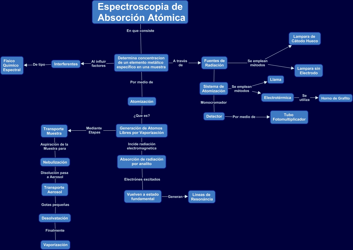 Este Cmap, tiene información relacionada con: mapa 1, Detector Por medio de Tubo Fotomultiplicador, Fuentes de Radiación ???? Sistema de Atomización, Sistema de Atomización Se emplean métodos Llama, Sistema de Atomización Monocromador Detector, Espectroscopia de Absorción Atómica En que consiste Determina concentracion de un elemento metálico específico en una muestra, Generación de Atomos Libres por Vaporización Mediante Etapas Transporte Muestra, Transporte Aerosol Gotas pequeñas Desolvatación, Absorción de radiación por analito Electrónes excitados Vuelven a estado fundamental, Determina concentracion de un elemento metálico específico en una muestra Al influir factores Interferentes, Determina concentracion de un elemento metálico específico en una muestra A través de Fuentes de Radiación, Fuentes de Radiación Se emplean métodos Lampara de Cátodo Hueco, Electrotérmica Se utiliza Horno de Grafito, Sistema de Atomización Se emplean métodos Electrotérmica, Fuentes de Radiación Se emplean métodos Lampara sin Electrodo, Vuelven a estado fundamental Generan Lineas de Resonáncia, Interferentes De tipo Físico Químico Espectral, Transporte Muestra Aspiración de la Muestra para Nebulización, Nebulización Disolución pasa a Aerosol Transporte Aerosol, Generación de Atomos Libres por Vaporización Incide radiación electromagnetica Absorción de radiación por analito, Determina concentracion de un elemento metálico específico en una muestra Por medio de Atomización