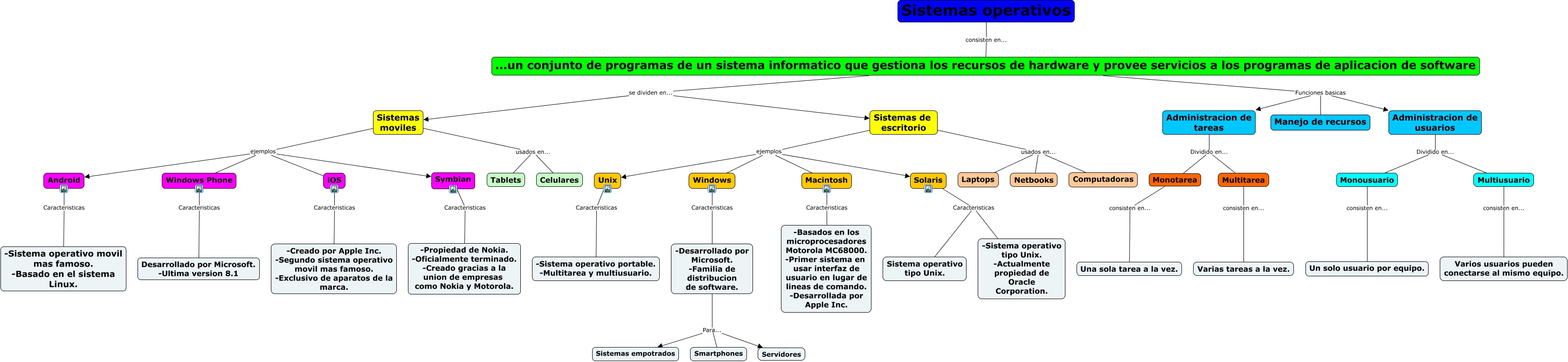 Este Cmap, tiene información relacionada con: Sistemas operativos, Sistemas moviles ejemplos Windows Phone, Sistemas moviles usados en... Tablets, ...un conjunto de programas de un sistema informatico que gestiona los recursos de hardware y provee servicios a los programas de aplicacion de software Funciones basicas Administracion de tareas, Solaris Caracteristicas Sistema operativo tipo Unix., Sistemas de escritorio usados en... Laptops, Administracion de usuarios Dividido en... Multiusuario, Sistemas de escritorio ejemplos Macintosh, Administracion de tareas Dividido en... Monotarea, -Desarrollado por Microsoft. -Familia de distribucion de software. Para... Smartphones, Administracion de usuarios Dividido en... Monousuario, Solaris Caracteristicas -Sistema operativo tipo Unix. -Actualmente propiedad de Oracle Corporation., Sistemas moviles ejemplos iOS, Multiusuario consisten en... Varios usuarios pueden conectarse al mismo equipo., Sistemas moviles ejemplos Symbian, Sistemas de escritorio ejemplos Unix, ...un conjunto de programas de un sistema informatico que gestiona los recursos de hardware y provee servicios a los programas de aplicacion de software se dividen en... Sistemas moviles, -Desarrollado por Microsoft. -Familia de distribucion de software. Para... Sistemas empotrados, Administracion de tareas Dividido en... Multitarea, Sistemas de escritorio usados en... Netbooks, Sistemas moviles ejemplos Android