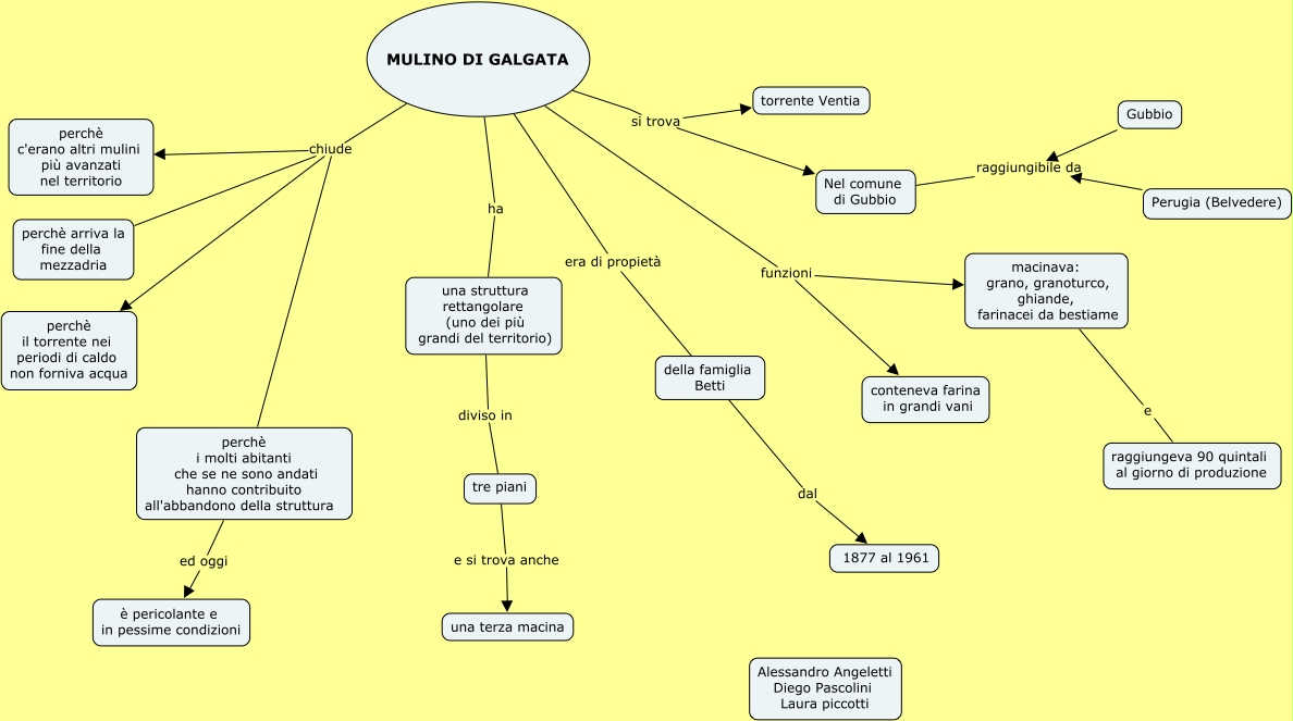 Questa Cmap, creata con IHMC CmapTools, contiene informazioni relative a: Galgata - Angeletti, della famiglia Betti dal 1877 al 1961, MULINO DI GALGATA si trova Nel comune di Gubbio, MULINO DI GALGATA chiude perchè c'erano altri mulini più avanzati nel territorio, MULINO DI GALGATA funzioni conteneva farina in grandi vani, MULINO DI GALGATA era di propietà della famiglia Betti, tre piani e si trova anche una terza macina, MULINO DI GALGATA chiude perchè i molti abitanti che se ne sono andati hanno contribuito all'abbandono della struttura, MULINO DI GALGATA chiude perchè il torrente nei periodi di caldo non forniva acqua, macinava: grano, granoturco, ghiande, farinacei da bestiame e raggiungeva 90 quintali al giorno di produzione, MULINO DI GALGATA ha una struttura rettangolare (uno dei più grandi del territorio), MULINO DI GALGATA funzioni macinava: grano, granoturco, ghiande, farinacei da bestiame, MULINO DI GALGATA si trova torrente Ventia, MULINO DI GALGATA chiude perchè arriva la fine della mezzadria, perchè i molti abitanti che se ne sono andati hanno contribuito all'abbandono della struttura ed oggi è pericolante e in pessime condizioni, una struttura rettangolare (uno dei più grandi del territorio) diviso in tre piani