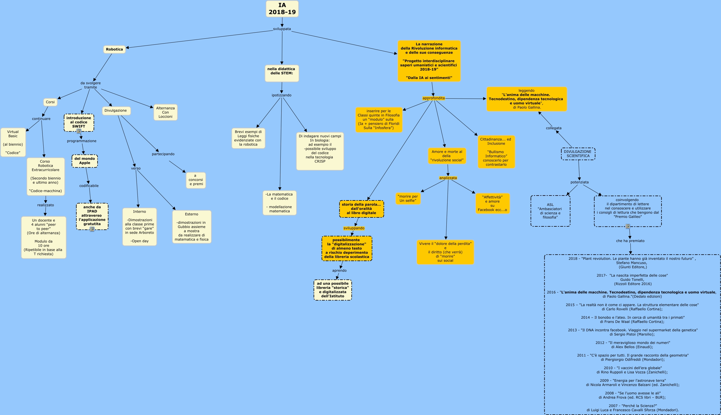 Questa Cmap, creata con IHMC CmapTools, contiene informazioni relative a: Progetto IA 2018 2019, Corsi continuare Virtual Basic (al biennio) “Codice”, possibilmente la "digitalizzazione" di almeno testo a rischio deperimento della libreria scolastica aprendo ad una possibile libreria "storica" e digitalizzata dell'Istituto, DIVULGAZIONE SCIENTIFICA potenziata ASL "Ambasciatori di scienza e filosofia", La narrazione della Rivoluzione informatica e delle sue conseguenze "Progetto interdisciplinare saperi umanistici e scientifici 2018-19" "Dalla IA ai sentimenti" approfondita Amore e morte al della “rivoluzione social”, Corso Robotica Extracurricolare (Secondo biennio e ultimo anno) “Codice-macchina) realizzato Un docente e 4 alunni “peer to peer” (Ore di alternanza) Modulo da 10 ore (Ripetibile in base alla T richiesta), Divulgazione verso Esterno -dimostrazioni in Gubbio assieme a mostra da realizzare di matematica e fisica, del mondo Apple codificabile anche da IPAD attraverso l'applicazione gratutita, Divulgazione verso Interno -Dimostrazioni alla classe prime con brevi “gare” in sede Arboreto -Open day, La narrazione della Rivoluzione informatica e delle sue conseguenze "Progetto interdisciplinare saperi umanistici e scientifici 2018-19" "Dalla IA ai sentimenti" approfondita leggendo "L'anima delle macchine. Tecnodestino, dipendenza tecnologica e uomo virtuale", di Paolo Gallina., Robotica da svolgere tramite Alternanza Con Loccioni, DIVULGAZIONE SCIENTIFICA potenziata coinvolgendo il dipartimento di lettere nel consoscere e utilizzare i consigli di lettura che bengono dal "Premio Galileo", DIVULGAZIONE SCIENTIFICA collegata leggendo "L'anima delle macchine. Tecnodestino, dipendenza tecnologica e uomo virtuale", di Paolo Gallina., IA 2018-19 sviluppata nella didattica delle STEM:, nella didattica delle STEM: ipotizzando -La matematica e il codice - modellazione matematica, La narrazione della Rivoluzione informatica e delle sue conseguenze "Progetto interdisciplinare saperi umanistici e scientifici 2018-19" "Dalla IA ai sentimenti" approfondita Cittadinanza... ed Inclusione “Bullismo Informatico” conoscerlo per contrastarlo, coinvolgendo il dipartimento di lettere nel consoscere e utilizzare i consigli di lettura che bengono dal "Premio Galileo" che ha premiato 2018 - "Plant revolution. Le piante hanno già inventato il nostro futuro" , Stefano Mancuso, (Giunti Editore,) 2017- "La nascita imperfetta delle cose" Guido Tonelli, (Rizzoli Editore 2016) 2016 - "L'anima delle macchine. Tecnodestino, dipendenza tecnologica e uomo virtuale, di Paolo Gallina."(Dedalo edizioni) 2015 – "La realtà non è come ci appare. La struttura elementare delle cose" di Carlo Rovelli (Raffaello Cortina); 2014 – Il bonobo e l’ateo. In cerca di umanità tra i primati" di Frans De Waal (Raffaello Cortina); 2013 - "Il DNA incontra facebook. Viaggio nel supermarket della genetica" di Sergio Pistoi (Marsilio); 2012 - "Il meraviglioso mondo dei numeri" di Alex Bellos (Einaudi); 2011 - "C’è spazio per tutti. Il grande racconto della geometria" di Piergiorgio Odifreddi (Mondadori); 2010 - "I vaccini dell’era globale" di Rino Ruppoli e Lisa Vozza (Zanichelli); 2009 - "Energia per l'astronave terra" di Nicola Armaroli e Vincenzo Balzani (ed. Zanichelli); 2008 - "Se l’uomo avesse le ali" di Andrea Frova (ed. RCS libri – BUR); 2007 - "Perché la Scienza?" di Luigi Luca e Francesco Cavalli Sforza (Mondadori)., IA 2018-19 sviluppata Robotica, La narrazione della Rivoluzione informatica e delle sue conseguenze "Progetto interdisciplinare saperi umanistici e scientifici 2018-19" "Dalla IA ai sentimenti" approfondita inserire per le Classi quinte in Filosofia un “modulo” sulla (Ia + pensiero di Floridi Sulla “Infosfera”), Robotica da svolgere tramite Corsi, Robotica da svolgere tramite Divulgazione