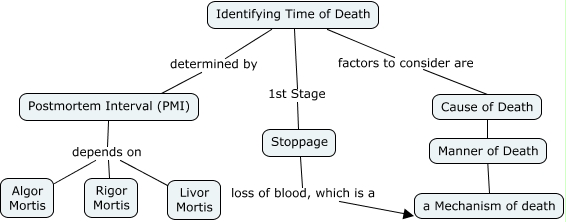 This Concept Map, created with IHMC CmapTools, has information related to: Identifying Time of Death, Postmortem Interval (PMI) depends on Algor Mortis, Postmortem Interval (PMI) depends on Livor Mortis, Identifying Time of Death determined by Postmortem Interval (PMI), Cause of Death ???? a Mechanism of death, Identifying Time of Death factors to consider are Cause of Death, Identifying Time of Death 1st Stage Stoppage, Stoppage loss of blood, which is a a Mechanism of death, Postmortem Interval (PMI) depends on Rigor Mortis