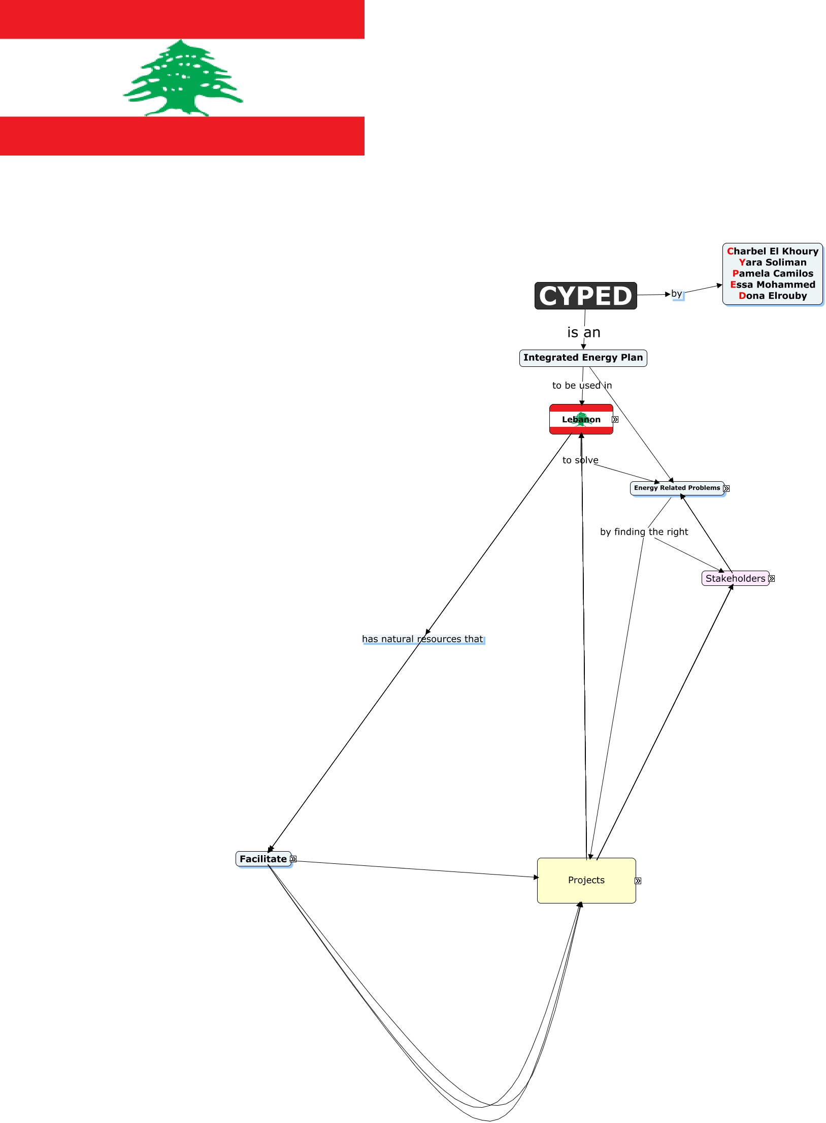 Questa Cmap, creata con IHMC CmapTools, contiene informazioni relative a: CYPED project, Creation of public organizations to deal with Blackouts and Brownouts, Physical Enviroment which are Coastal, Electricity by Wind Energy, Excessive time needed to come with Enviromental Assessments, Heat by Cooling Down Systems for machines, Complex turbine systems to Mechanical, Lebanon has natural resources that Facilitate, Mild and Rainy Winters Giving Wind Energy, Wind Energy converred by Complex turbine systems, Homes could create Electricity, International Debts which cause Economical destabilization, Smart Traffic Plans to regulate Excess Traffic, Electricity by Solar Energy, Mechanical taken from Solar Energy, Excessive time needed to come with Urgently Needed Solutions, De-centralization of Goverment which cause Economical destabilization, Hot Summers that are Dry, Mechanical taken from Hydropower, Hot Summers which melt the Snow, Stakeholders which are divided into Private Sector