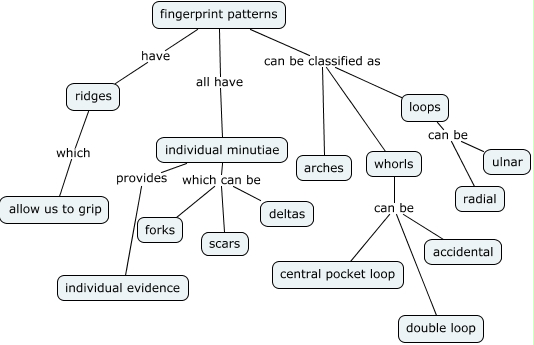This Concept Map, created with IHMC CmapTools, has information related to: Fingerprint Patterns, loops can be ulnar, whorls can be accidental, fingerprint patterns can be classified as whorls, individual minutiae which can be scars, ridges which allow us to grip, whorls can be double loop, whorls can be central pocket loop, fingerprint patterns all have individual minutiae, individual minutiae provides individual evidence, individual minutiae which can be forks, individual minutiae which can be deltas, fingerprint patterns have ridges, fingerprint patterns can be classified as arches, loops can be radial, fingerprint patterns can be classified as loops