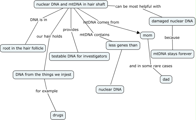 This Concept Map, created with IHMC CmapTools, has information related to: Untitled 3, less genes than nuclear DNA, damaged nuclear DNA because mtDNA stays forever, DNA from the things we injest for example drugs, nuclear DNA and mtDNA in hair shaft provides testable DNA for investigators, mom and in some rare cases dad, nuclear DNA and mtDNA in hair shaft can be most helpful with damaged nuclear DNA, nuclear DNA and mtDNA in hair shaft DNA is in root in the hair follicle, nuclear DNA and mtDNA in hair shaft mtDNA contains less genes than, nuclear DNA and mtDNA in hair shaft mtDNA comes from mom, nuclear DNA and mtDNA in hair shaft our hair holds DNA from the things we injest