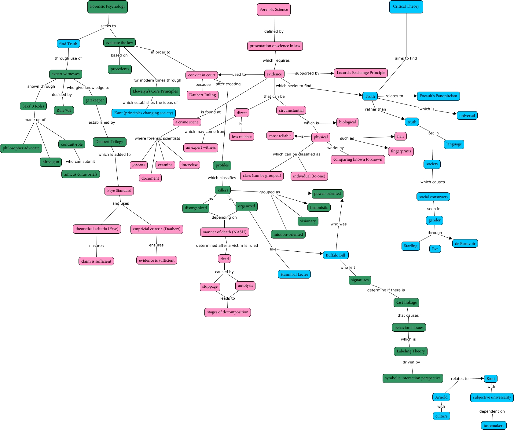 This Concept Map, created with IHMC CmapTools, has information related to: Extra Credit FORENSICS, autolysis leads to stages of decomposition, Buffalo Bill who was power-oriented, evidence which seeks to find Truth, Truth rather than truth, killers grouped as power-oriented, evaluate the law based on precedents, truth lost in language, expert witnesses shown through Saks' 3 Roles, Saks' 3 Roles made up of philosopher advocate, evidence used to convict in court, physical is most reliable, circumstantial which is physical, evidence that can be direct, profiles which classifies killers, subjective universality dependent on tastemakers, expert witnesses decided by Rule 702, evaluate the law in order to convict in court, killers as organized, Saks' 3 Roles made up of conduit-role, physical which can be classified as individual (to one)