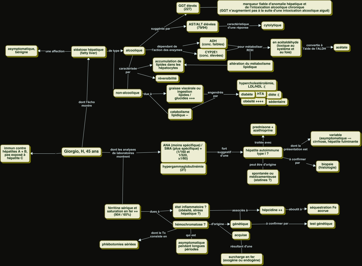 Cette carte de concepts créée avec IHMC CmapTools traite de: Guoruey_MMD2232_Divers, CYP2E1 (conc. élevées) pour métaboliser ROH accumulation de lipides dans les hépatocytes, état inflammatoire ? (obésité, stress hépatique ?) associés à hépcidine ++, AST/ALT élévées (79/94) caractéristique d'une réponse cytolytique, ANA (moins spécifique) / SMA (plus spécifique) + (1/160 et 1/320, ≥1/80) fort suggestif d'une hépatite autoimmune type I ?, non-alcoolique due à graisse viscérale ou ingestion lipides / glucides +++, catabolisme lipidique -- engendrés par diabète, stéatose hépatique (fatty liver) une affection asymptomatique, bénigne, Giorgio, H, 45 ans dont les analyses de laboratoires montrent ANA (moins spécifique) / SMA (plus spécifique) + (1/160 et 1/320, ≥1/80), hépatite autoimmune type I ? dont la présentation est variable (asymptomatique --» cirrhose, hépatite fulminante, alcoolique dépendant de l'action des enzymes ADH (conc. faibles), hémochromatose ? qui est asymptomatique pendant longues périodes, hépcidine ++ aboutit à séquestration Fe accrue, génétique associés à hépcidine ++, hépatite autoimmune type I ? à confirmer par biopsie (histologie), alcoolique caractérisée par accumulation de lipides dans les hépatocytes, ADH (conc. faibles) pour métaboliser ROH en acétaldéhyde (toxique au système et au foie), ADH (conc. faibles) pour métaboliser ROH accumulation de lipides dans les hépatocytes, en acétaldéhyde (toxique au système et au foie) convertie à l'aide de l'ALDH acétate, férritine sérique et saturation en fer ++ (904 / 65%) dues à hémochromatose ?, férritine sérique et saturation en fer ++ (904 / 65%) dues à état inflammatoire ? (obésité, stress hépatique ?)