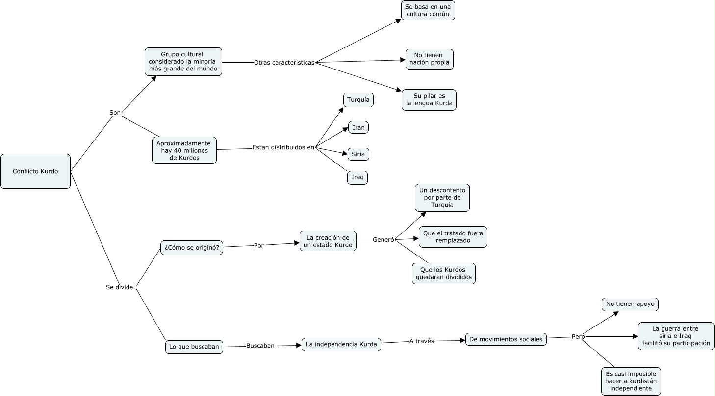 Este Cmap, tiene información relacionada con: Conflicto Kurdo, De movimientos sociales Pero La guerra entre siria e Iraq facilitó su participación, ¿Cómo se originó? Por La creación de un estado Kurdo, Grupo cultural considerado la minoría más grande del mundo Otras caracteristicas Se basa en una cultura común, Grupo cultural considerado la minoría más grande del mundo Otras caracteristicas Su pilar es la lengua Kurda, Grupo cultural considerado la minoría más grande del mundo Otras caracteristicas No tienen nación propia, La creación de un estado Kurdo Generó Un descontento por parte de Turquía, Conflicto Kurdo Son Aproximadamente hay 40 millones de Kurdos, La creación de un estado Kurdo Generó Que los Kurdos quedaran divididos, Aproximadamente hay 40 millones de Kurdos Estan distribuidos en Siria, ¿Cómo se originó? Se divide Lo que buscaban, De movimientos sociales Pero No tienen apoyo, Aproximadamente hay 40 millones de Kurdos Estan distribuidos en Iraq, Conflicto Kurdo Son Grupo cultural considerado la minoría más grande del mundo, La creación de un estado Kurdo Generó Que él tratado fuera remplazado, Lo que buscaban Buscaban La independencia Kurda, Aproximadamente hay 40 millones de Kurdos Estan distribuidos en Turquía, De movimientos sociales Pero Es casi imposible hacer a kurdistán independiente, Aproximadamente hay 40 millones de Kurdos Estan distribuidos en Iran, La independencia Kurda A través De movimientos sociales, Conflicto Kurdo Se divide Lo que buscaban