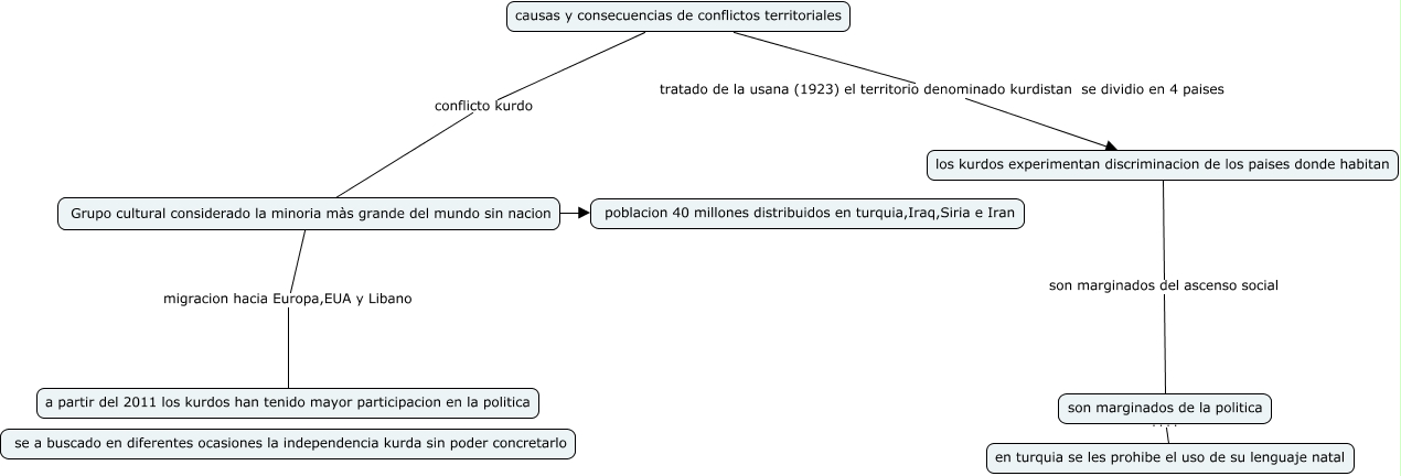 Este Cmap, tiene información relacionada con: causas y consecuencias 1, son marginados de la politica ???? en turquia se les prohibe el uso de su lenguaje natal, causas y consecuencias de conflictos territoriales conflicto kurdo Grupo cultural considerado la minoria màs grande del mundo sin nacion, los kurdos experimentan discriminacion de los paises donde habitan son marginados del ascenso social son marginados de la politica, Grupo cultural considerado la minoria màs grande del mundo sin nacion migracion hacia Europa,EUA y Libano a partir del 2011 los kurdos han tenido mayor participacion en la politica, Grupo cultural considerado la minoria màs grande del mundo sin nacion ???? poblacion 40 millones distribuidos en turquia,Iraq,Siria e Iran, causas y consecuencias de conflictos territoriales tratado de la usana (1923) el territorio denominado kurdistan se dividio en 4 paises los kurdos experimentan discriminacion de los paises donde habitan