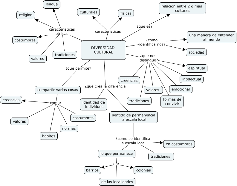 Este Cmap, tiene información relacionada con: geografia, DIVERSIDAD CULTURAL ¿que crea la diferencia identidad de individuos, compartir varias cosas como: creencias, sentido de permanencia a escala local ¿como se identifica a escala local tradiciones, sentido de permanencia a escala local ¿como se identifica a escala local lo que permanece, DIVERSIDAD CULTURAL ¿que nos distingue? creencias, compartir varias cosas como: valores, lo que permanece en: colonias, DIVERSIDAD CULTURAL ¿que nos distingue? formas de convivir, lo que permanece en: barrios, DIVERSIDAD CULTURAL caracteristicas etnicas tradiciones, DIVERSIDAD CULTURAL ¿como identificarnos? una manera de entender al mundo, DIVERSIDAD CULTURAL ¿como identificarnos? sociedad, DIVERSIDAD CULTURAL caracteristicas etnicas costumbres, DIVERSIDAD CULTURAL ¿que nos distingue? intelectual, sentido de permanencia a escala local ¿como se identifica a escala local en costumbres, DIVERSIDAD CULTURAL ¿que nos distingue? emocional, DIVERSIDAD CULTURAL ¿que nos distingue? valores, compartir varias cosas como: costumbres, compartir varias cosas como: habitos, DIVERSIDAD CULTURAL caracteristicas culturales