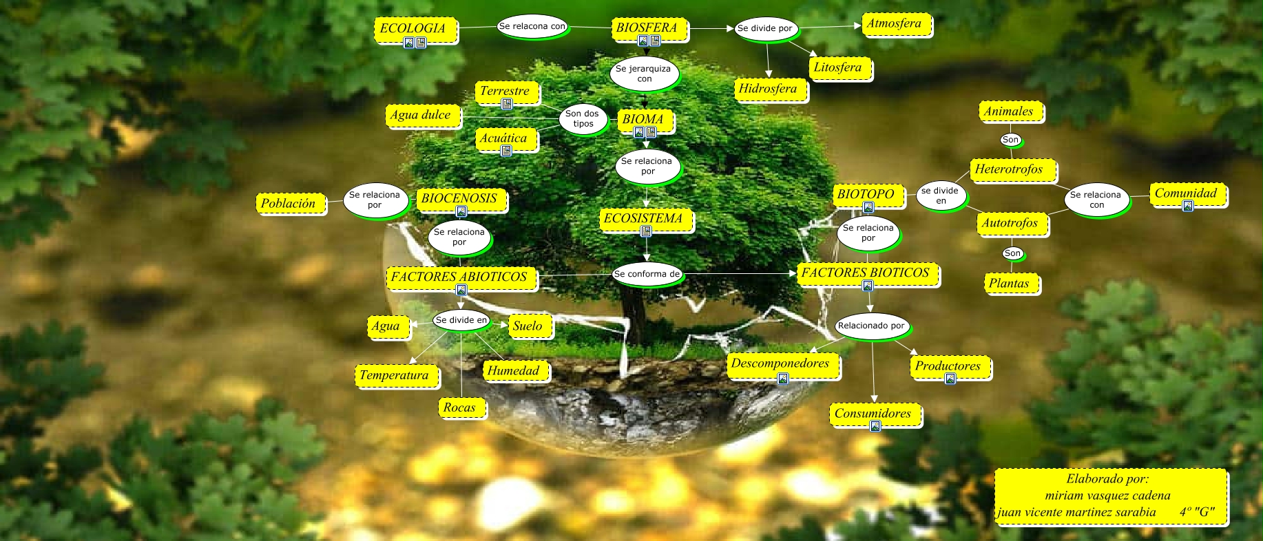 Este Cmap, tiene información relacionada con: ECOLOGIA, BIOTOPO Se relaciona por FACTORES BIOTICOS, FACTORES ABIOTICOS Se divide en Temperatura, BIOCENOSIS Se relaciona por FACTORES ABIOTICOS, Autotrofos Son Plantas, FACTORES ABIOTICOS Se divide en Suelo, BIOSFERA Se jerarquiza con BIOMA, FACTORES ABIOTICOS Se divide en Agua, FACTORES ABIOTICOS Se divide en Humedad, ECOLOGIA Se relacona con BIOSFERA, BIOCENOSIS Se relaciona por Población, BIOMA Son dos tipos Agua dulce, BIOTOPO se divide en Autotrofos, ECOSISTEMA Se conforma de FACTORES ABIOTICOS, BIOSFERA Se divide por Atmosfera, BIOTOPO se divide en Heterotrofos, Heterotrofos Son Animales, BIOMA Son dos tipos Acuática, BIOSFERA Se divide por Litosfera, Autotrofos Se relaciona con Comunidad, FACTORES BIOTICOS Relacionado por Productores