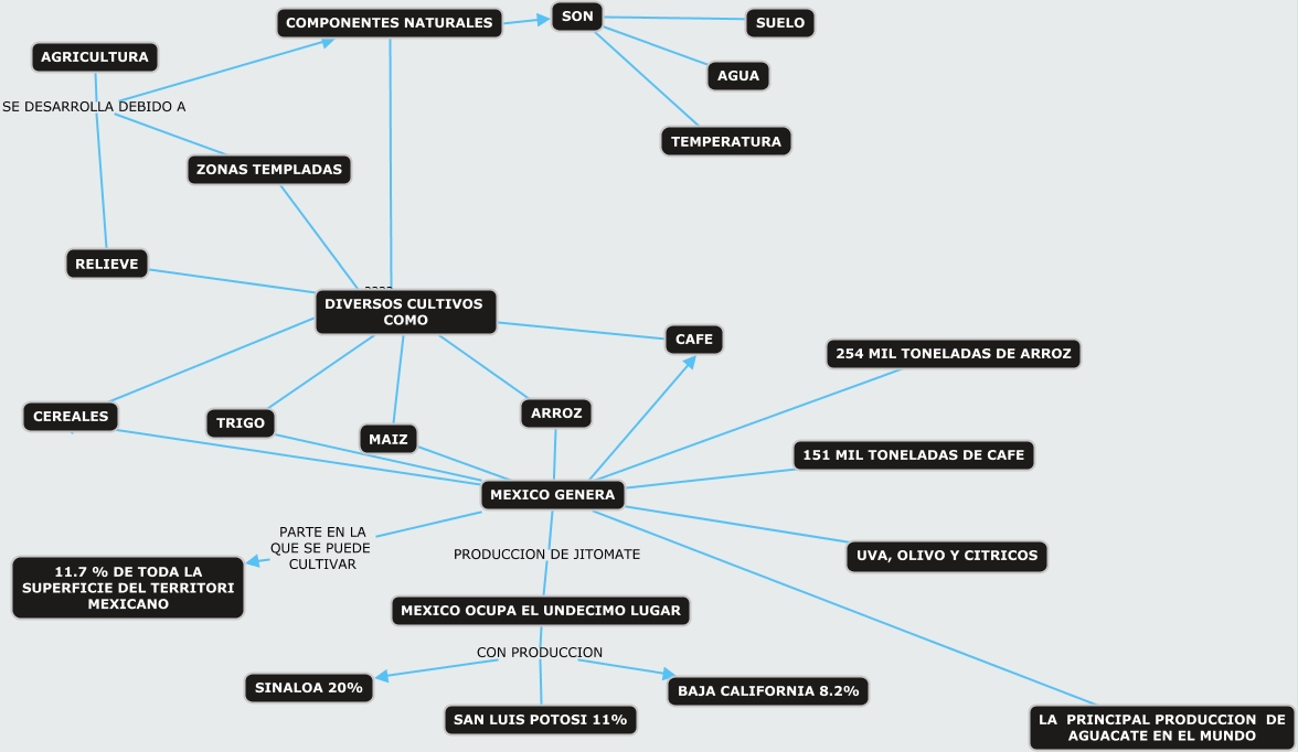 Este Cmap, tiene información relacionada con: AGRICULTURA, RELIEVE DIVERSOS CULTIVOS COMO, MEXICO OCUPA EL UNDECIMO LUGAR CON PRODUCCION SAN LUIS POTOSI 11%, MEXICO GENERA ???? 254 MIL TONELADAS DE ARROZ, COMPONENTES NATURALES DIVERSOS CULTIVOS COMO, MEXICO GENERA ???? MAIZ, COMPONENTES NATURALES ???? SON, MEXICO GENERA PRODUCCION DE JITOMATE MEXICO OCUPA EL UNDECIMO LUGAR, DIVERSOS CULTIVOS COMO ???? MAIZ, AGRICULTURA SE DESARROLLA DEBIDO A ZONAS TEMPLADAS, MEXICO GENERA ???? TRIGO, DIVERSOS CULTIVOS COMO ???? ARROZ, DIVERSOS CULTIVOS COMO ???? CAFE, DIVERSOS CULTIVOS COMO ???? CEREALES, ZONAS TEMPLADAS ???? DIVERSOS CULTIVOS COMO, MEXICO GENERA ???? LA PRINCIPAL PRODUCCION DE AGUACATE EN EL MUNDO, DIVERSOS CULTIVOS COMO ???? TRIGO, AGRICULTURA SE DESARROLLA DEBIDO A COMPONENTES NATURALES, MEXICO OCUPA EL UNDECIMO LUGAR CON PRODUCCION SINALOA 20%, SON ???? TEMPERATURA, ARROZ MEXICO GENERA MEXICO GENERA