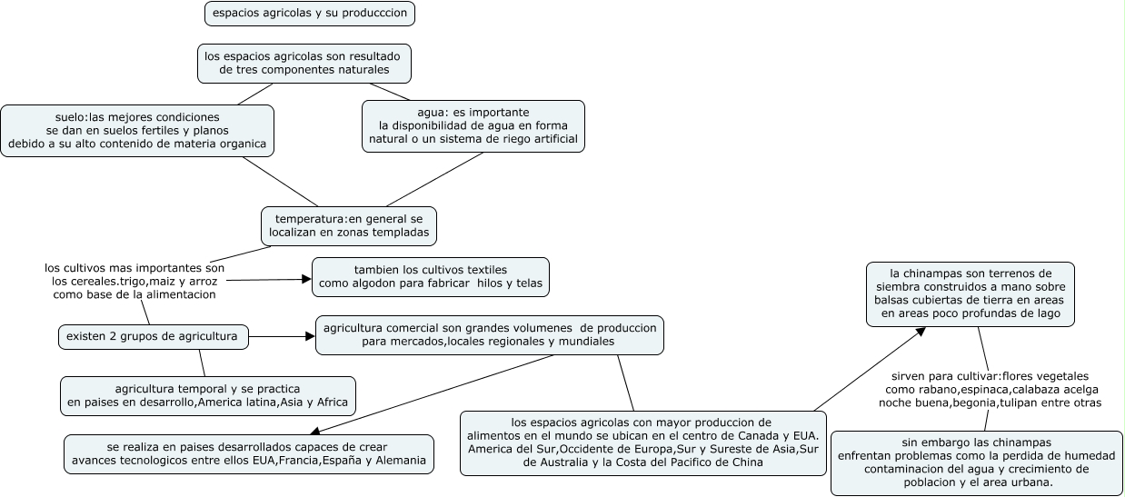 Este Cmap, tiene información relacionada con: Agricultura, temperatura:en general se localizan en zonas templadas los cultivos mas importantes son los cereales.trigo,maiz y arroz como base de la alimentacion tambien los cultivos textiles como algodon para fabricar hilos y telas, los espacios agricolas con mayor produccion de alimentos en el mundo se ubican en el centro de Canada y EUA. America del Sur,Occidente de Europa,Sur y Sureste de Asia,Sur de Australia y la Costa del Pacifico de China ???? la chinampas son terrenos de siembra construidos a mano sobre balsas cubiertas de tierra en areas en areas poco profundas de lago, agricultura comercial son grandes volumenes de produccion para mercados,locales regionales y mundiales ???? los espacios agricolas con mayor produccion de alimentos en el mundo se ubican en el centro de Canada y EUA. America del Sur,Occidente de Europa,Sur y Sureste de Asia,Sur de Australia y la Costa del Pacifico de China, la chinampas son terrenos de siembra construidos a mano sobre balsas cubiertas de tierra en areas en areas poco profundas de lago sirven para cultivar:flores vegetales como rabano,espinaca,calabaza acelga noche buena,begonia,tulipan entre otras sin embargo las chinampas enfrentan problemas como la perdida de humedad contaminacion del agua y crecimiento de poblacion y el area urbana., agricultura comercial son grandes volumenes de produccion para mercados,locales regionales y mundiales ???? se realiza en paises desarrollados capaces de crear avances tecnologicos entre ellos EUA,Francia,España y Alemania, agua: es importante la disponibilidad de agua en forma natural o un sistema de riego artificial ???? temperatura:en general se localizan en zonas templadas, los espacios agricolas son resultado de tres componentes naturales ???? agua: es importante la disponibilidad de agua en forma natural o un sistema de riego artificial, existen 2 grupos de agricultura ???? agricultura comercial son grandes volumenes de produccion para mercados,locales regionales y mundiales, temperatura:en general se localizan en zonas templadas los cultivos mas importantes son los cereales.trigo,maiz y arroz como base de la alimentacion existen 2 grupos de agricultura, los espacios agricolas son resultado de tres componentes naturales ???? suelo:las mejores condiciones se dan en suelos fertiles y planos debido a su alto contenido de materia organica, suelo:las mejores condiciones se dan en suelos fertiles y planos debido a su alto contenido de materia organica ???? temperatura:en general se localizan en zonas templadas, existen 2 grupos de agricultura ???? agricultura temporal y se practica en paises en desarrollo,America latina,Asia y Africa