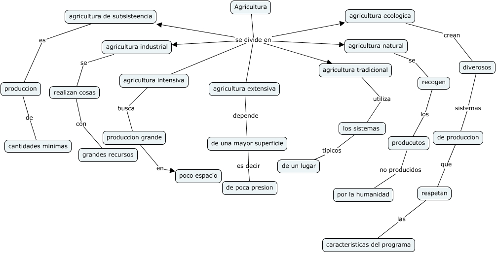 Este Cmap, tiene información relacionada con: agricultura, Agricultura se divide en agricultura industrial, de produccion que respetan, agricultura natural se recogen, de una mayor superficie es decir de poca presion, produccion grande en poco espacio, Agricultura se divide en agricultura extensiva, agricultura extensiva depende de una mayor superficie, Agricultura se divide en agricultura intensiva, recogen los producutos, agricultura intensiva busca produccion grande, agricultura industrial se realizan cosas, Agricultura se divide en agricultura tradicional, agricultura ecologica crean diverosos, los sistemas tipicos de un lugar, agricultura de subsisteencia es produccion, Agricultura se divide en agricultura ecologica, produccion de cantidades minimas, Agricultura se divide en agricultura natural, diverosos sistemas de produccion, agricultura tradicional utiliza los sistemas