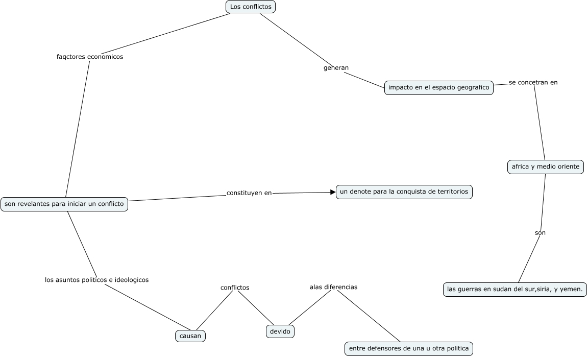 Este Cmap, tiene información relacionada con: conflictos, impacto en el espacio geografico se concetran en africa y medio oriente, son revelantes para iniciar un conflicto los asuntos politicos e ideologicos causan, devido alas diferencias entre defensores de una u otra politica, son revelantes para iniciar un conflicto constituyen en un denote para la conquista de territorios, africa y medio oriente son las guerras en sudan del sur,siria, y yemen., causan conflictos devido, Los conflictos generan impacto en el espacio geografico, Los conflictos faqctores economicos son revelantes para iniciar un conflicto