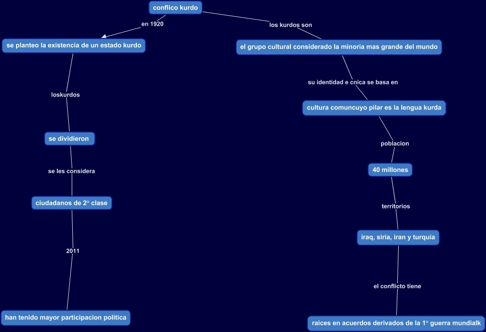 Este Cmap, tiene información relacionada con: conflicto kurdo, conflico kurdo los kurdos son el grupo cultural considerado la minoria mas grande del mundo, se dividieron se les considera ciudadanos de 2° clase, 40 millones territorios iraq, siria, iran y turquia, iraq, siria, iran y turquia el conflicto tiene raices en acuerdos derivados de la 1° guerra mundialk, ciudadanos de 2° clase 2011 han tenido mayor participacion politica, se planteo la existencia de un estado kurdo loskurdos se dividieron, cultura comuncuyo pilar es la lengua kurda poblacion 40 millones, conflico kurdo en 1920 se planteo la existencia de un estado kurdo, el grupo cultural considerado la minoria mas grande del mundo su identidad e cnica se basa en cultura comuncuyo pilar es la lengua kurda