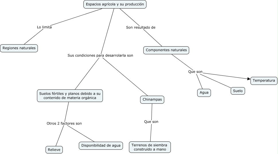 Este Cmap, tiene información relacionada con: Agricultura, Chinampas Que son Terrenos de siembra construido a mano, Espacios agrícola y su producción Son resultado de Componentes naturales, Espacios agrícola y su producción Sus condiciones para desarrolarla son Suelos fértiles y planos debido a su contenido de materia orgánica, Espacios agrícola y su producción Lo limita Regiones naturales, Espacios agrícola y su producción Sus condiciones para desarrolarla son Chinampas, Componentes naturales Que son Suelo, Componentes naturales Que son Agua, Suelos fértiles y planos debido a su contenido de materia orgánica Otros 2 factores son Relieve, Suelos fértiles y planos debido a su contenido de materia orgánica Otros 2 factores son Disponibilidad de agua, Componentes naturales Que son Temperatura