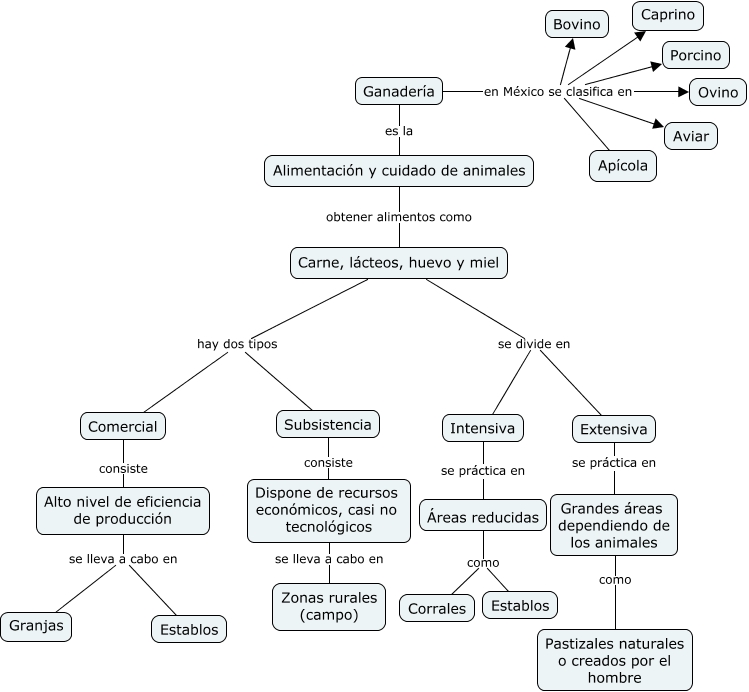 Este Cmap, tiene información relacionada con: Ganadería, Dispone de recursos económicos, casi no tecnológicos se lleva a cabo en Zonas rurales (campo), Carne, lácteos, huevo y miel hay dos tipos Comercial, Alto nivel de eficiencia de producción se lleva a cabo en Establos, Ganadería en México se clasifica en Apícola, Ganadería en México se clasifica en Caprino, Grandes áreas dependiendo de los animales como Pastizales naturales o creados por el hombre, Ganadería en México se clasifica en Bovino, Ganadería en México se clasifica en Ovino, Extensiva se práctica en Grandes áreas dependiendo de los animales, Áreas reducidas como Corrales, Comercial consiste Alto nivel de eficiencia de producción, Carne, lácteos, huevo y miel hay dos tipos Subsistencia, Intensiva se práctica en Áreas reducidas, Carne, lácteos, huevo y miel se divide en Intensiva, Carne, lácteos, huevo y miel se divide en Extensiva, Áreas reducidas como Establos, Ganadería en México se clasifica en Porcino, Subsistencia consiste Dispone de recursos económicos, casi no tecnológicos, Ganadería es la Alimentación y cuidado de animales, Ganadería en México se clasifica en Aviar