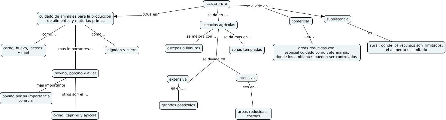 Este Cmap, tiene información relacionada con: Ganaderia, comercial son... areas reducidas con especial cuidado como veterinarios, donde los ambientes pueden ser controlados, cuidado de animales para la producción de alimentos y materias primas como... carne, huevo, lacteos y miel, GANADERIA se da en ... espacios agricolas, bovino, porcino y aviar otros son el ... ovino, caprino y apicola, intensiva ees en... areas reducidas, corraes, GANADERIA se divide en ... comercial, espacios agricolas se diviide en... extensiva, GANADERIA se divide en ... subsistencia, cuidado de animales para la producción de alimentos y materias primas como... algodon y cuero, subsistencia es... rural, donde los recursos son limitados, el alimento es limitado, GANADERIA ¿Que es? cuidado de animales para la producción de alimentos y materias primas, espacios agricolas se mejora con... estepas o llanuras, espacios agricolas se da mas en... zonas templadas, extensiva es en.... grandes pastizales, cuidado de animales para la producción de alimentos y materias primas más importantes... bovino, porcino y aviar, bovino, porcino y aviar mas importante bovino por su importancia comrcial, espacios agricolas se diviide en... intensiva