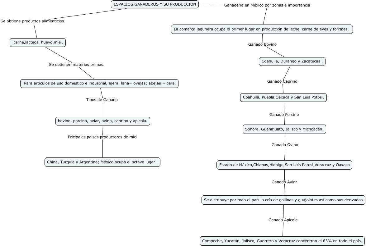 Este Cmap, tiene información relacionada con: ganaderia, Coahuila, Durango y Zacatecas . Ganado Caprino Coahuila, Puebla,Oaxaca y San Luis Potosi., ESPACIOS GANADEROS Y SU PRODUCCION Se obtiene productos alimenticios. carne,lacteos, huevo,miel., Coahuila, Puebla,Oaxaca y San Luis Potosi. Ganado Porcino Sonora, Guanajuato, Jalisco y Michoacán., Para articulos de uso domestico e industrial, ejem: lana= ovejas; abejas = cera. Tipos de Ganado bovino, porcino, aviar, ovino, caprino y apicola., Estado de México,Chiapas,Hidalgo,San Luis Potosi,Veracruz y Oaxaca Ganado Aviar Se distribuye por todo el país la cría de gallinas y guajolotes así como sus derivados, bovino, porcino, aviar, ovino, caprino y apicola. Pricipales paises productores de miel China, Turquia y Argentina; México ocupa el octavo lugar ., Sonora, Guanajuato, Jalisco y Michoacán. Ganado Ovino Estado de México,Chiapas,Hidalgo,San Luis Potosi,Veracruz y Oaxaca, carne,lacteos, huevo,miel. Se obtienen materias primas. Para articulos de uso domestico e industrial, ejem: lana= ovejas; abejas = cera., Se distribuye por todo el país la cría de gallinas y guajolotes así como sus derivados Ganado Apicola Campeche, Yucatán, Jalisco, Guerrero y Veracruz concentran el 63% en todo el país., La comarca lagunera ocupa el primer lugar en producción de leche, carne de aves y forrajes. Ganado Bovino Coahuila, Durango y Zacatecas ., ESPACIOS GANADEROS Y SU PRODUCCION Ganaderia en México por zonas e importancia La comarca lagunera ocupa el primer lugar en producción de leche, carne de aves y forrajes.
