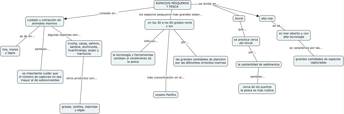 Este Cmap, tiene información relacionada con: pesca, cuidado y extracciòn de animales marinos algunas especies son... trucha, carpa, salmon, sardina, anchoveta, huachinango, pulpo y marisccos, ESPACIOS PESQUEROS Y PESCA los espacios pesqueros mas grandes estan... en los 30 a los 60 grados norte y sur, ESPACIOS PESQUEROS Y PESCA consiste en... cuidado y extracciòn de animales marinos, trucha, carpa, salmon, sardina, anchoveta, huachinango, pulpo y marisccos otros productos son... grasas, aceites, esponjas y algas, cuidado y extracciòn de animales marinos tambien... es importante cuidar que el nùmero de capturas no sea mayor al de sobrevivientes, ESPACIOS PESQUEROS Y PESCA se divide en... alta mar, en mar abierto y con alta tecnologìa se caracteriza por las... grandes cantidades de especies capturadas, en los 30 a los 60 grados norte y sur màs concentraciòn en el... oceano Pacìfco, la cantantidad de sedimentos tambien... cerca de los puertos la pesca es mas rustica, ESPACIOS PESQUEROS Y PESCA se divide en... litoral, litoral que... se practica cerca del litoral, alta mar se da... en mar abierto y con alta tecnologìa, se practica cerca del litoral por... la cantantidad de sedimentos, en los 30 a los 60 grados norte y sur por... las grandes cantidades de plancton por las diferentes orrientes marinas, cuidado y extracciòn de animales marinos se da en... rìos, mares y lagos, en los 30 a los 60 grados norte y sur influyen... la tecnologia y herramientas cambian el rendimiento de la pesca