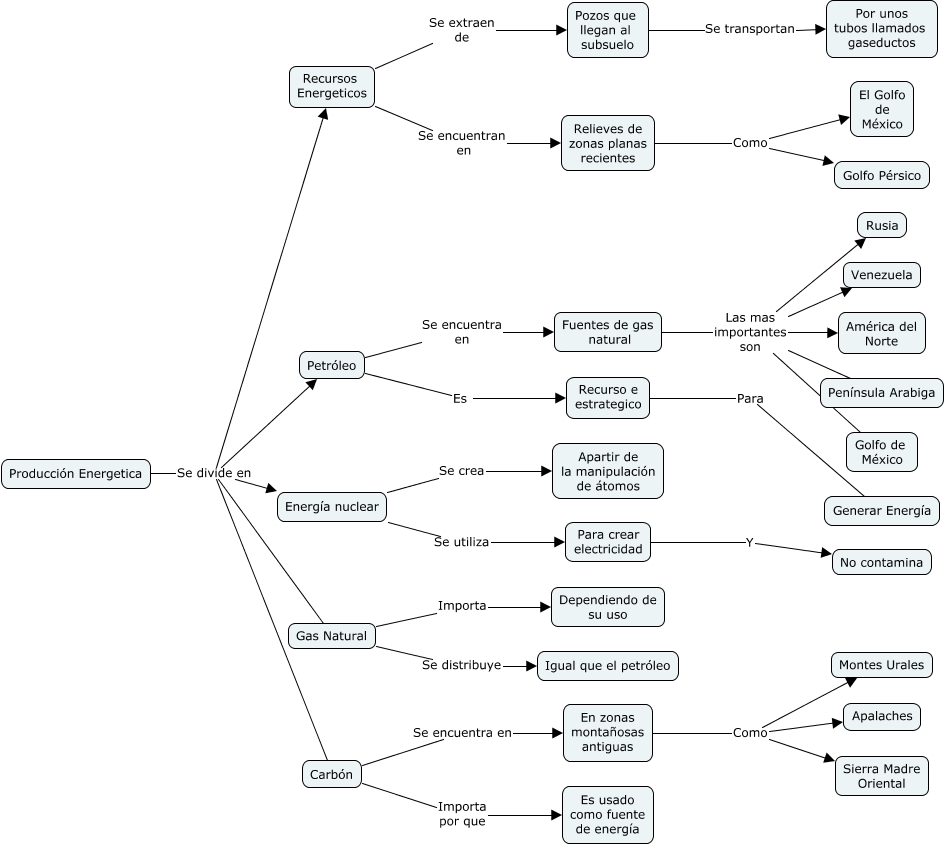 Este Cmap, tiene información relacionada con: Recursos Energeticos, En zonas montañosas antiguas Como Apalaches, Fuentes de gas natural Las mas importantes son Rusia, Energía nuclear Se utiliza Para crear electricidad, Relieves de zonas planas recientes Como Golfo Pérsico, Pozos que llegan al subsuelo Se transportan Por unos tubos llamados gaseductos, Petróleo Es Recurso e estrategico, Producción Energetica Se divide en Petróleo, Para crear electricidad Y No contamina, Gas Natural Importa Dependiendo de su uso, Recursos Energeticos Se encuentran en Relieves de zonas planas recientes, Fuentes de gas natural Las mas importantes son Venezuela, Relieves de zonas planas recientes Como El Golfo de México, Recurso e estrategico Para Generar Energía, Fuentes de gas natural Las mas importantes son América del Norte, Fuentes de gas natural Las mas importantes son Península Arabiga, En zonas montañosas antiguas Como Montes Urales, Producción Energetica Se divide en Energía nuclear, Gas Natural Se distribuye Igual que el petróleo, Producción Energetica Se divide en Carbón, Producción Energetica Se divide en Gas Natural
