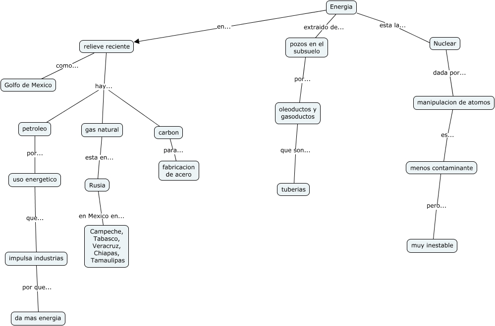 Este Cmap, tiene información relacionada con: Energia, oleoductos y gasoductos que son... tuberias, gas natural esta en... Rusia, relieve reciente hay... petroleo, carbon para... fabricacion de acero, uso energetico que... impulsa industrias, relieve reciente hay... gas natural, relieve reciente como... Golfo de Mexico, Energia en... relieve reciente, menos contaminante pero... muy inestable, Rusia en Mexico en... Campeche, Tabasco, Veracruz, Chiapas, Tamaulipas, pozos en el subsuelo por... oleoductos y gasoductos, relieve reciente hay... carbon, impulsa industrias por que... da mas energia, manipulacion de atomos es... menos contaminante, Nuclear dada por... manipulacion de atomos, petroleo por... uso energetico, Energia extraido de... pozos en el subsuelo, Energia esta la... Nuclear