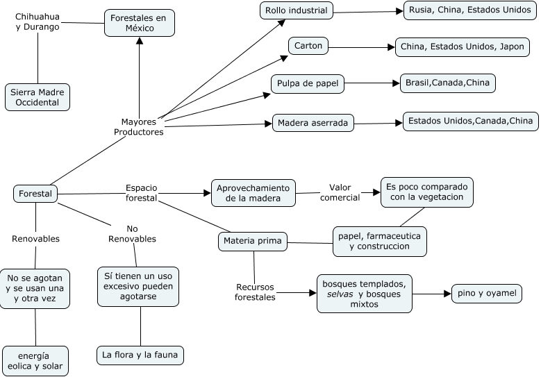 Este Cmap, tiene información relacionada con: forestal, Forestal Mayores Productores Forestales en México, Forestal No Renovables Sí tienen un uso excesivo pueden agotarse, Forestal Mayores Productores Carton, Forestal Mayores Productores Rollo industrial, Madera aserrada ???? Estados Unidos,Canada,China, Forestal Mayores Productores Madera aserrada, Forestal Mayores Productores Pulpa de papel, bosques templados, selvas y bosques mixtos ???? pino y oyamel, Forestal Espacio forestal Materia prima, Materia prima ???? papel, farmaceutica y construccion, Es poco comparado con la vegetacion ???? papel, farmaceutica y construccion, Forestal Espacio forestal Aprovechamiento de la madera, Pulpa de papel ???? Brasil,Canada,China, Aprovechamiento de la madera Valor comercial Es poco comparado con la vegetacion, No se agotan y se usan una y otra vez ???? energía eolica y solar, Sí tienen un uso excesivo pueden agotarse ???? La flora y la fauna, Carton ???? China, Estados Unidos, Japon, Materia prima Recursos forestales bosques templados, selvas y bosques mixtos, Forestales en México Chihuahua y Durango Sierra Madre Occidental, Forestal Renovables No se agotan y se usan una y otra vez