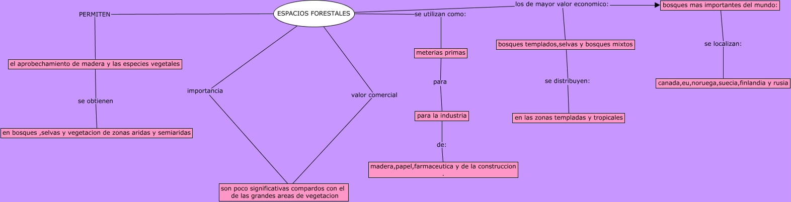Este Cmap, tiene información relacionada con: espacios forestales, para la industria de: madera,papel,farmaceutica y de la construccion ., ESPACIOS FORESTALES PERMITEN el aprobechamiento de madera y las especies vegetales, bosques templados,selvas y bosques mixtos se distribuyen: en las zonas templadas y tropicales, ESPACIOS FORESTALES los de mayor valor economico: bosques templados,selvas y bosques mixtos, ESPACIOS FORESTALES valor comercial son poco significativas compardos con el de las grandes areas de vegetacion, ESPACIOS FORESTALES importancia ????, ESPACIOS FORESTALES los de mayor valor economico: bosques mas importantes del mundo:, bosques mas importantes del mundo: se localizan: canada,eu,noruega,suecia,finlandia y rusia, el aprobechamiento de madera y las especies vegetales se obtienen en bosques ,selvas y vegetacion de zonas aridas y semiaridas, ESPACIOS FORESTALES se utilizan como: meterias primas, meterias primas para para la industria