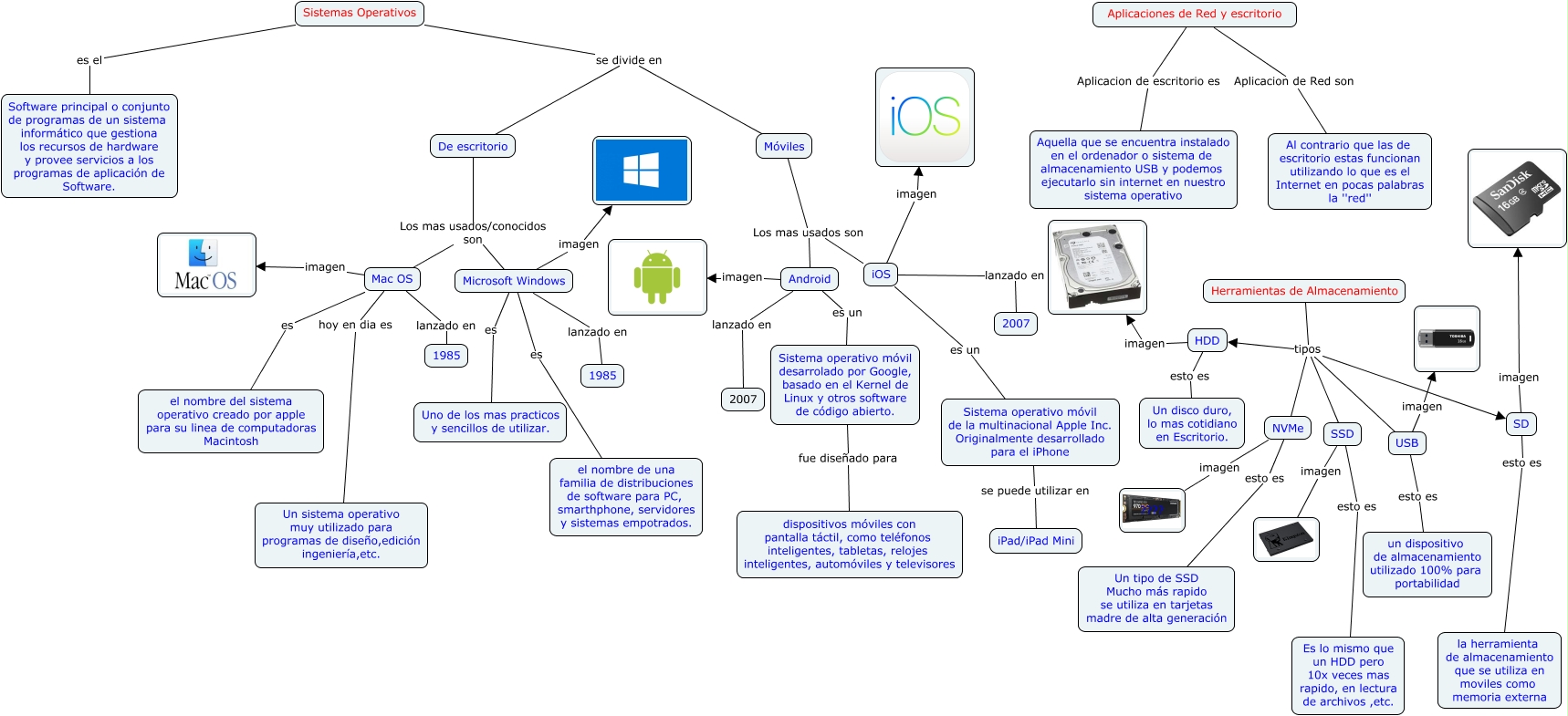 Este Cmap, tiene información relacionada con: Mapa conceptual, Sistemas operativos, App Red ,Herramientas de almacenamiento, Microsoft Windows lanzado en 1985, Mac OS imagen, Aplicaciones de Red y escritorio Aplicacion de escritorio es Aquella que se encuentra instalado en el ordenador o sistema de almacenamiento USB y podemos ejecutarlo sin internet en nuestro sistema operativo, SSD imagen, iOS imagen, HDD esto es Un disco duro, lo mas cotidiano en Escritorio., Android lanzado en 2007, Sistema operativo móvil desarrolado por Google, basado en el Kernel de Linux y otros software de código abierto. fue diseñado para dispositivos móviles con pantalla táctil, como teléfonos inteligentes, tabletas, relojes inteligentes, automóviles y televisores, Android es un Sistema operativo móvil desarrolado por Google, basado en el Kernel de Linux y otros software de código abierto., Herramientas de Almacenamiento tipos NVMe, Mac OS hoy en dia es Un sistema operativo muy utilizado para programas de diseño,edición ingeniería,etc., Aplicaciones de Red y escritorio Aplicacion de Red son Al contrario que las de escritorio estas funcionan utilizando lo que es el Internet en pocas palabras la ''red'', USB esto es un dispositivo de almacenamiento utilizado 100% para portabilidad, NVMe imagen ????, Android imagen, Microsoft Windows es el nombre de una familia de distribuciones de software para PC, smarthphone, servidores y sistemas empotrados., Mac OS es el nombre del sistema operativo creado por apple para su linea de computadoras Macintosh, SD esto es la herramienta de almacenamiento que se utiliza en moviles como memoria externa, Sistemas Operativos es el Software principal o conjunto de programas de un sistema informático que gestiona los recursos de hardware y provee servicios a los programas de aplicación de Software., Herramientas de Almacenamiento tipos SD